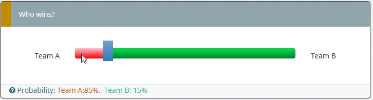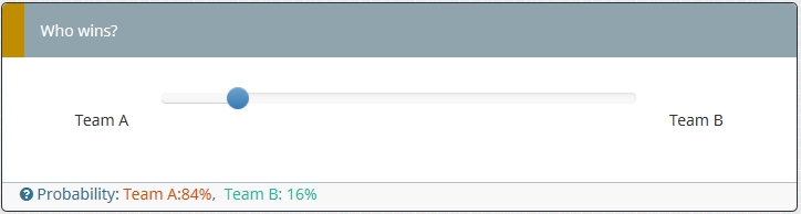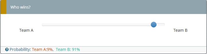 Probability: <span style="color:#d35400;">Team A:{100-Q1_SQ001.NAOK}%</span>, <span style="color:#1abc9c;">Team B: {Q1_SQ001.NAOK}%</span>