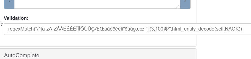 regexMatch("/^[a-zA-ZÀÂÉÊÈËÌÏÎÔÙÛÇÆŒàâéêèëìïîôùûçæœ '-]{3,100}$/",html_entity_decode(self.NAOK))