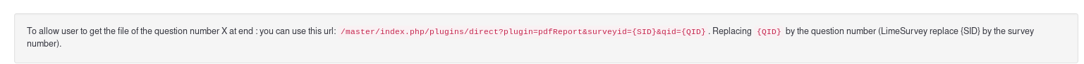 <a href="/survey/index.php?r=plugins/direct&plugin=pdfReport&surveyid={SID}&qid={pdf.qid}" title="Print answers" class=" ls-print "> Download your PDF. </a>