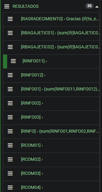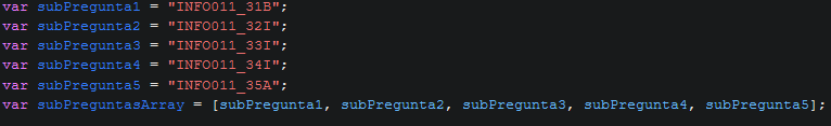 $(function(){ //Estos son los contadores que tendremos para saber cuantas subpreguntas son del tipo básico, intermedio o avanzado. var contB = 0; var contI = 0; var contA = 0; //Esta variable recoge el ID de la pregunta actual var thisQuestion = $('#question{QID}'); //Esta variable nos dice cuantas subpreguntas tiene la pregunta. var total = '{count(that.INFO012)}'; //Aquí tenemos los códigos de las subpreguntas. var subPregunta1 = "INFO012_41B"; var subPregunta2 = "INFO012_42B"; var subPregunta3 = "INFO012_43B"; var subPregunta4 = "INFO012_44B"; var subPregunta5 = "INFO012_45I"; var subPregunta6 = "INFO012_46A"; var subPregunta7 = "INFO012_47I"; var subPregunta8 = "INFO012_48A"; var subPreguntasArray = [subPregunta1, subPregunta2, subPregunta3, subPregunta4, subPregunta5, subPregunta6, subPregunta7, subPregunta8]; //En este bucle identificamos el nivel de las subpreguntas. for(var i = 0; i < total ;i++){ if (subPreguntasArray[i].slice(-1) == "B") { contB++; } else if (subPreguntasArray[i].slice(-1) == "I") { contI++; } else if (subPreguntasArray[i].slice(-1) == "A") { contA++; } } //Aquí determinamos la prioridad de cada uno y obtenemos los porcentajes. contB = contB * 1.25; contI = contI * 1.5; contA = contA * 1.75; var contTotal = contB + contI + contA; var porcentajeB = 1.25 / contTotal; var porcentajeI = 1.5 / contTotal; var porcentajeA = 1.75 / contTotal; var valorPreg1 = '{that.INFO012.sq_1}'; var valorPreg2 = '{that.INFO012.sq_2}'; var valorPreg3 = '{that.INFO012.sq_3}'; var valorPreg4 = '{INFO012_44B}'; var valorPreg5 = '{that.INFO012.sq_5}'; var valorPreg6 = '{that.INFO012.sq_6}'; var valorPreg7 = '{that.INFO012.sq_7}'; var valorPreg8 = '{that.INFO012.sq_8}'; var valorPregArray = [valorPreg1, valorPreg2, valorPreg3, valorPreg4, valorPreg5, valorPreg6, valorPreg7, valorPreg8]; for(var i = 0; i < total ;i++){ //Aquí ponderamos los resultados if (subPreguntasArray[i].slice(-1) == "B") { valorPregArray[i] = valorPregArray[i] * porcentajeB; } else if (subPreguntasArray[i].slice(-1) == "I") { valorPregArray[i] = valorPregArray[i] * porcentajeI; } else if (subPreguntasArray[i].slice(-1) == "A") { valorPregArray[i] = valorPregArray[i] * porcentajeA; } } var valorTotal = 0; //Finalmente sumamos todas las subpreguntas ponderadas para lograr el resultado for(var i = 0; i < total; i++){ valorTotal = valorTotal + valorPregArray[i]; } //Si la pregunta es de tipo Si-No, descomenta la siguiente línea //valorTotal = valorTotal * 10; //Redondeamos el valor. var redondear = Math.round(valorTotal); //Aquí es donde asignamos el valor total. $('input:text', thisQuestion).val(redondear).trigger('keyup'); });