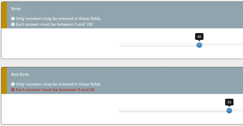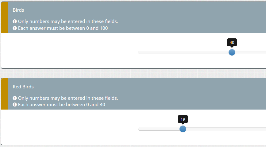 You should have seen an error. As you see in the settings of min, max,... the curly brackets are there already (displayed in the gray parts of the input field). So, if you enter something there - without curly brackets.I'm trying to enter: {NumberBirds.shown} in the Q2 field for Slider maximum value but it's not working.
