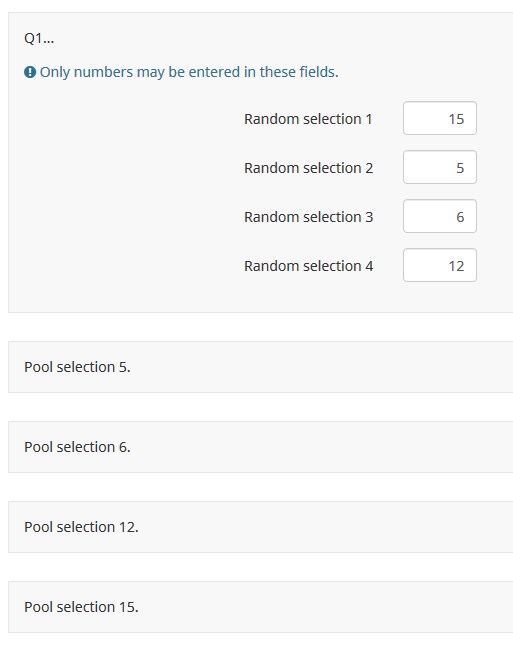 <script type="text/javascript" charset="utf-8"> $(document).on('ready pjax:scriptcomplete',function(){ // Identify this question var thisQuestion = $('#question{QID}'); // Define the pool var pool = [1,2,3,4,5,6,7,8,9,10,11,12,13,14,15,16]; // Shuffle the pool shuffleArray(pool); console.log('log - pool: '+ pool); // Define the exclusions var exclusions = { 1: [3,5,7,9,13], 2: [4,6,8,10,14], 3: [1,5,7,11,15], 4: [2,6,8,12,16], 5: [1,3,7,9,13], 6: [2,4,8,10,14], 7: [1,3,5,11,15], 8: [2,4,6,12,16], 9: [11,13,15,1,5], 10: [12,14,16,2,6], 11: [9,13,15,3,7], 12: [10,14,16,4,8], 13: [9,11,15,1,5], 14: [10,12,16,2,6], 15: [9,11,13,3,7], 16: [10,12,14,4,8] } // Loop through the multiple-numeric inputs $('input:text', thisQuestion).each(function(i){ // Load the input with the first element of the pool array var thisNumber = pool[0]; $('input:text:eq('+i+')', thisQuestion).val(thisNumber).trigger('keyup'); // Now, remove the first element of the pool array pool.splice(0, 1); // Remove pool elements per the exclusions var theseExclusions = exclusions[thisNumber]; console.log('log - exclusions: '+ theseExclusions); $.each(theseExclusions, function(i, val) { var index = pool.indexOf(val); if (index > -1) { pool.splice(index, 1); } }); console.log('log - pool: '+ pool); }); }); function shuffleArray(array) { for (var i = array.length - 1; i > 0; i--) { var j = Math.floor(Math.random() * (i + 1)); var temp = array[i]; array[i] = array[j]; array[j] = temp; } return array; } </script>