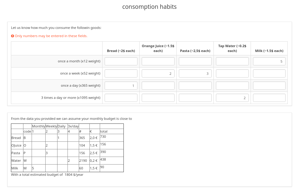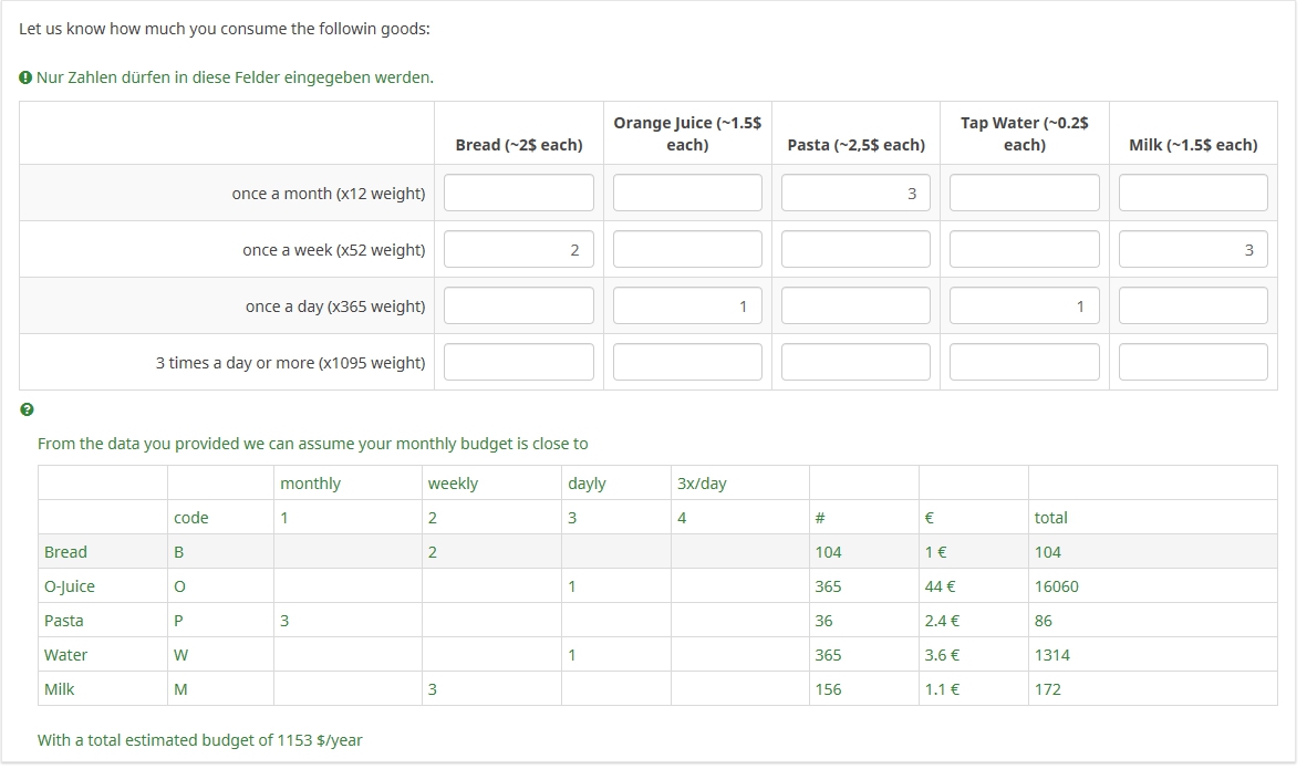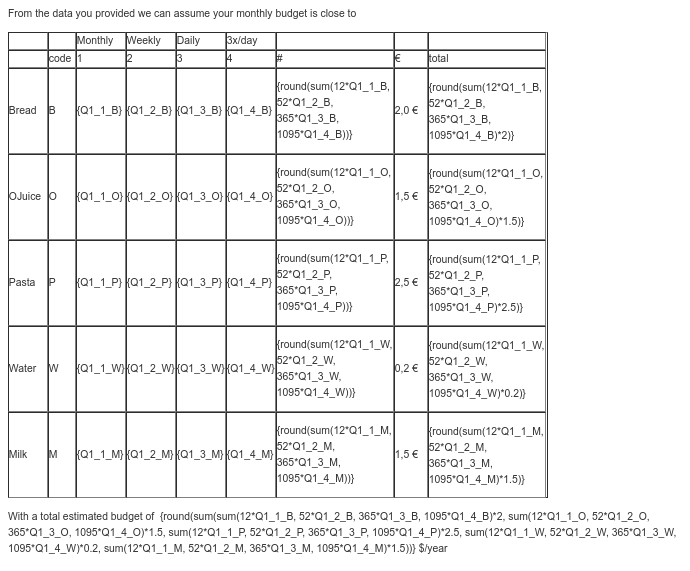 <tr> <td>{pp_B.question}</td> <td>B</td> <td>{Q1_1_B}</td> <td>{Q1_2_B}</td> <td>{Q1_3_B}</td> <td>{Q1_4_B}</td> <td>{round(sum(ww_1*Q1_1_B, ww_2*Q1_2_B, ww_3*Q1_3_B, ww_4*Q1_4_B))}</td> <td>{pp_B} €</td> <td>{round(sum(ww_1*Q1_1_B, ww_2*Q1_2_B, ww_3*Q1_3_B, ww_4*Q1_4_B)*pp_B)}</td> </tr> <tr> <td>{pp_O.question}</td> <td>O</td> <td>{Q1_1_O}</td> <td>{Q1_2_O}</td> <td>{Q1_3_O}</td> <td>{Q1_4_O}</td> <td>{round(sum(ww_1*Q1_1_O, ww_2*Q1_2_O, ww_3*Q1_3_O, ww_4*Q1_4_O))}</td> <td>{pp_O} €</td> <td>{round(sum(ww_1*Q1_1_O, ww_2*Q1_2_O, ww_3*Q1_3_O, ww_4*Q1_4_O)*pp_O)}</td> </tr>