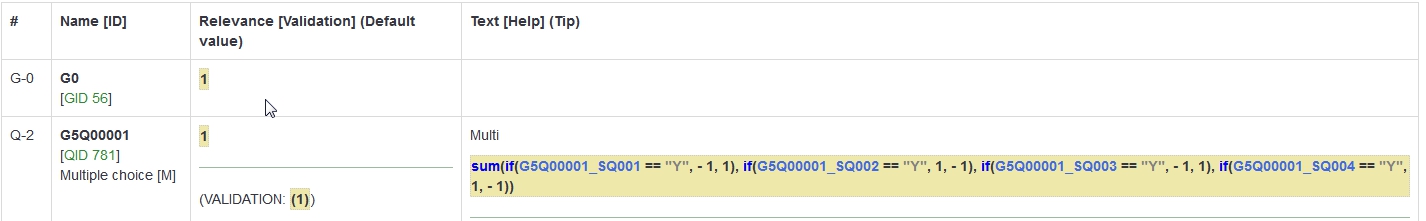 {sum(if(G5Q00001_SQ001 == "Y", -1, 1), if(G5Q00001_SQ002 == "Y", 1, -1), if(G5Q00001_SQ003 == "Y", -1, 1), if(G5Q00001_SQ004 == "Y", 1, -1))}
