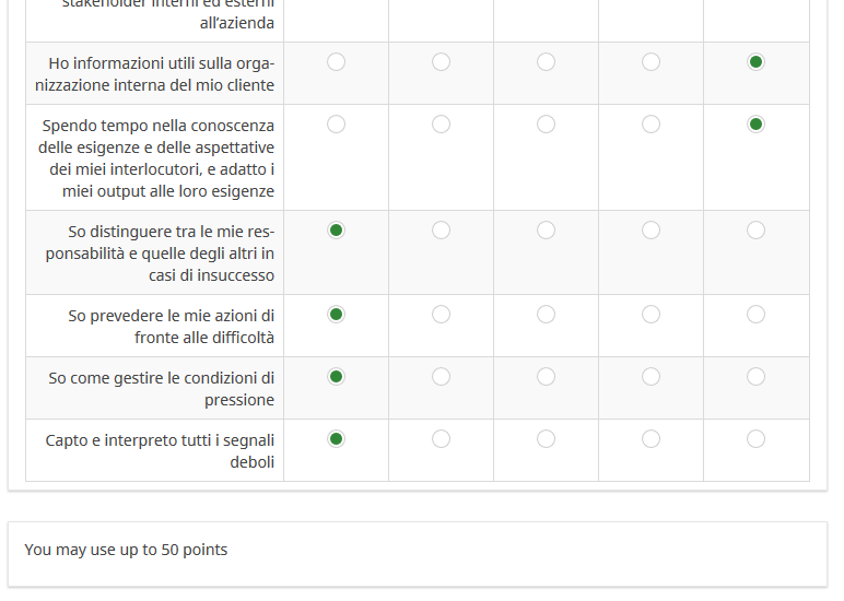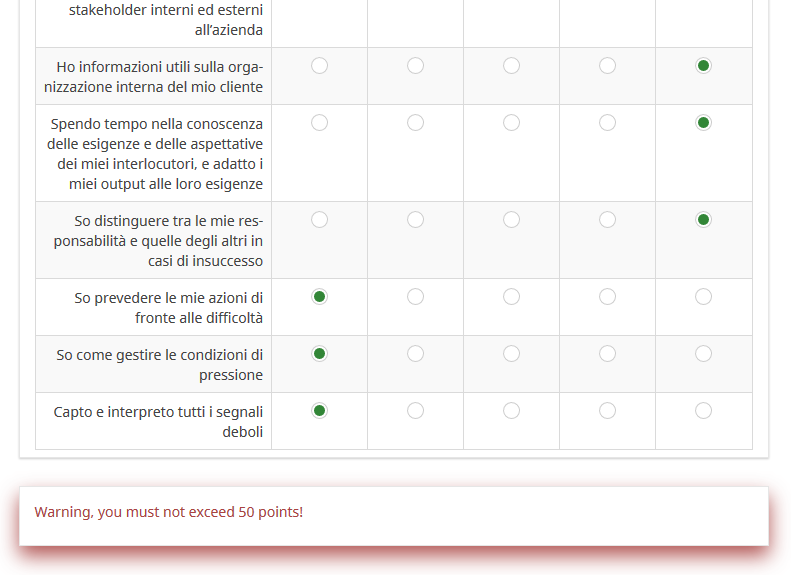 <p>{if(control1 <= 50, 'You may use up to 50 points', '<span class="text-danger">Warning, you must not exceed 50 points!</span>')}</p> <script type="text/javascript" charset="utf-8"> $(document).on('ready pjax:scriptcomplete',function(){ var thisQuestion = $('#question{QID}'); var arrayQuestion = $(thisQuestion).prevAll('.question-container:eq(0)'); // Listener on the radio buttons $('input:radio', arrayQuestion).on('click', function(e) { var points = 0; $('tr.answers-list:visible input:radio:checked', arrayQuestion).each(function(i) { points = points + Number($(this).val()); }); $('input:text', thisQuestion).val(points).trigger('change'); }); // Hide some elements $('.question-valid-container, .answer-container', thisQuestion).hide(); }); </script>