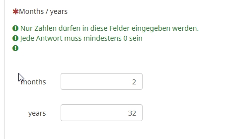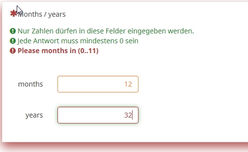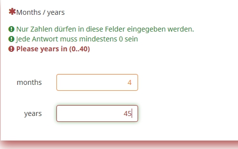 And a validation tip like: {if(Q1_months>11,"Please months in (0..11)",if(Q1_years>40,"Please years in (0..40)",""))} or whatever you like.