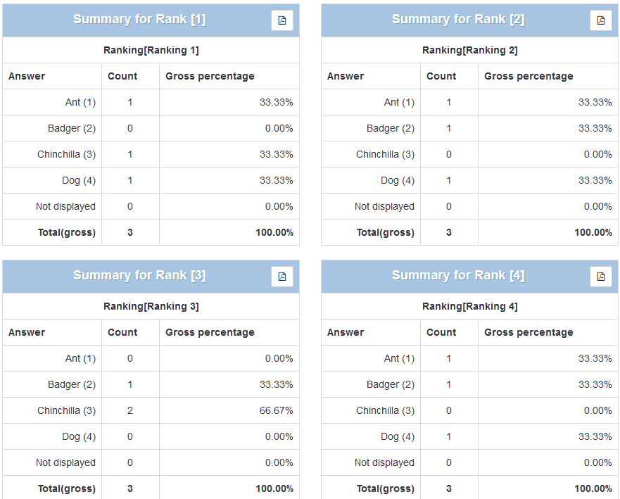 You see: For each rank there are the counts and percentages of the ranked objects.