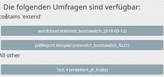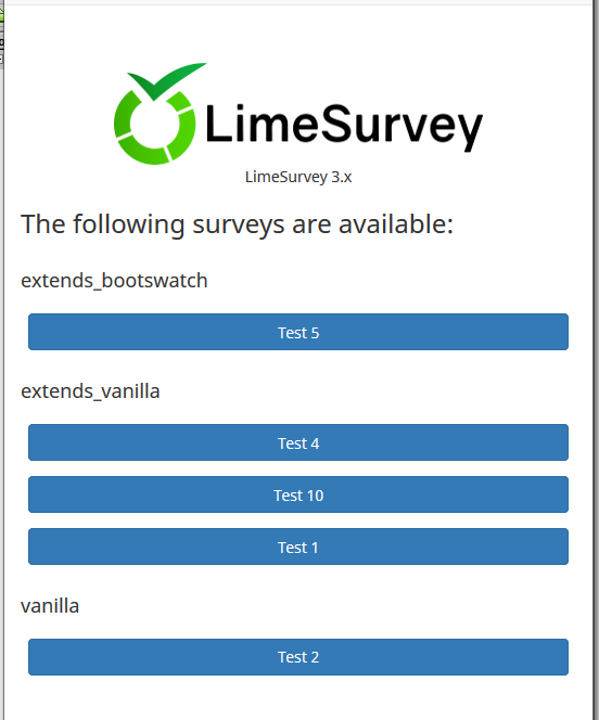 <h4>Vanilla</h4> <ul class='{{ aSurveyInfo.class.surveylistrowdivbdivul }} list-unstyled ' {{ aSurveyInfo.attr.surveylistrowdivbdivul }}> {% for key, oSurvey in aSurveyInfo.publicSurveys %} {% if oSurvey.template == 'vanilla' %} <li class="{{ aSurveyInfo.class.surveylistrowdivbdivulli }} btn-group col-sm-6 col-xs-12" {{ aSurveyInfo.attr.surveylistrowdivbdivulli }}> <a href="{{ oSurvey.sSurveyUrl }}" title="{{ gT("Start survey") }}" lang="{{ oSurvey.language }}" class="{{ aSurveyInfo.class.surveylistrowdivbdivullia }} btn btn-primary col-xs-12" > {{ oSurvey.localizedTitle }} </a> </li> {% endif %} {% endfor %} </ul> <h4>Other Themes</h4> <ul class='{{ aSurveyInfo.class.surveylistrowdivbdivul }} list-unstyled ' {{ aSurveyInfo.attr.surveylistrowdivbdivul }}> {% for key, oSurvey in aSurveyInfo.publicSurveys %} {% if oSurvey.template != 'vanilla' %} <li class="{{ aSurveyInfo.class.surveylistrowdivbdivulli }} btn-group col-sm-6 col-xs-12" {{ aSurveyInfo.attr.surveylistrowdivbdivulli }}> <a href="{{ oSurvey.sSurveyUrl }}" title="{{ gT("Start survey") }}" lang="{{ oSurvey.language }}" class="{{ aSurveyInfo.class.surveylistrowdivbdivullia }} btn btn-primary col-xs-12" > {{ oSurvey.localizedTitle }} </a> </li> {% endif %} {% endfor %} </ul>