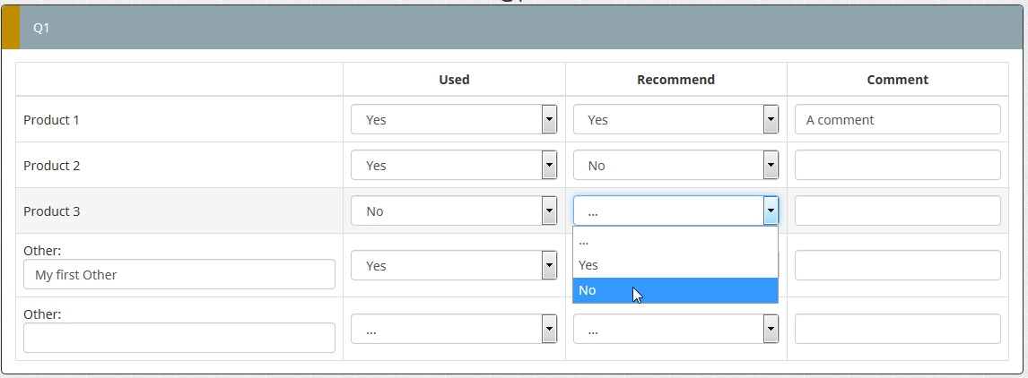 I am putting together a survey in which one question will ask them to evaluate different virtual learning web conferencing options. I want to list a number of software packages (eg. Adobe connect, webex, zoom), ask faculty if they have used them, if they would recommend them, and force them to give a comment on each package that they have used. It would essentially be three columns. I can't figure out how to make two columns yes/no then force the comment for each software that they have used.