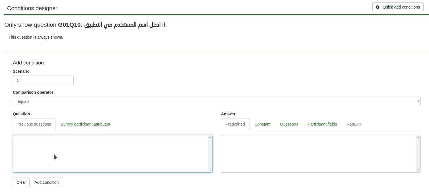 What I understand from this page is that I should specify the question on which the condition is checked