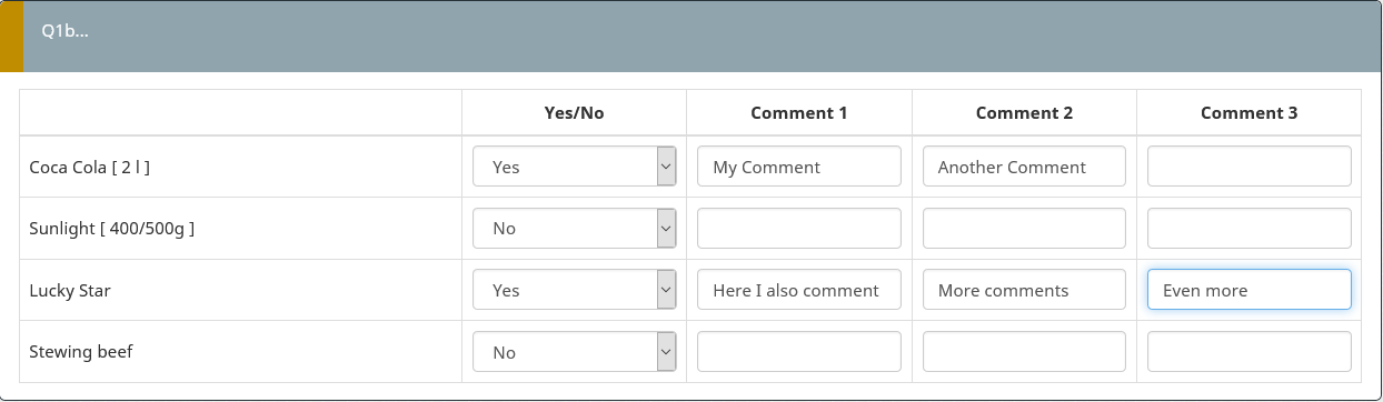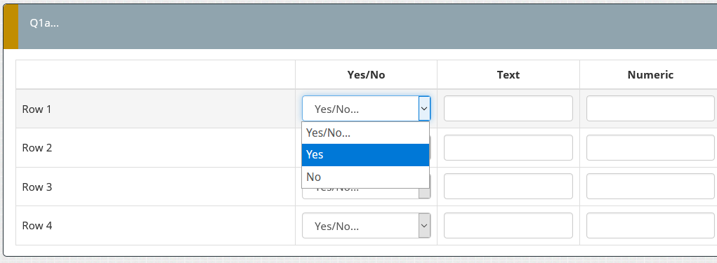You may insert a dropdown in the first column with "Yes/No" and two or more "normal" text inputs.