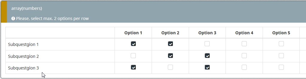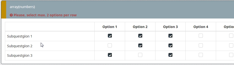 I have a number array in checkbox layout with several rows and also several columns. I would like to limit the number of answers (= checked boxes) per row to two. I already found the solution to use a validation equation, but it produces a really confusing error message ("recheck your answer format" ???) no matter how many boxes per row are checked.