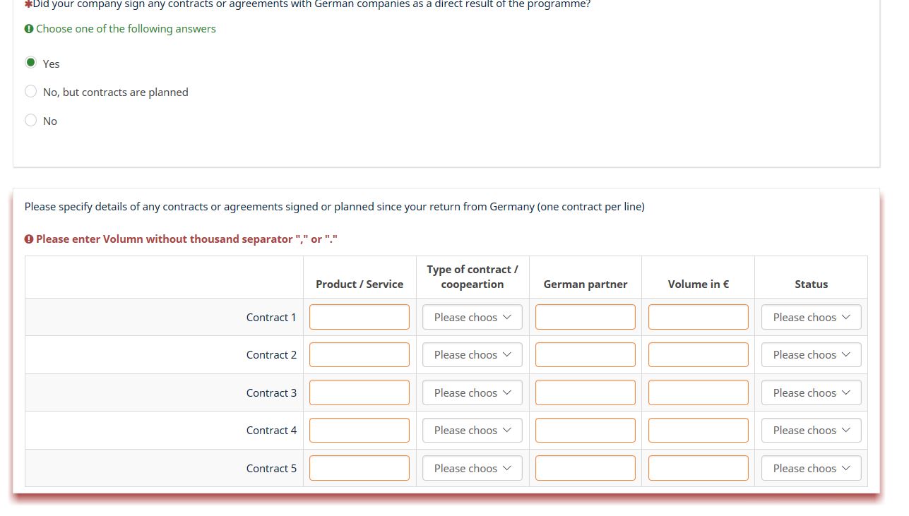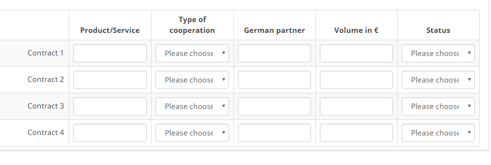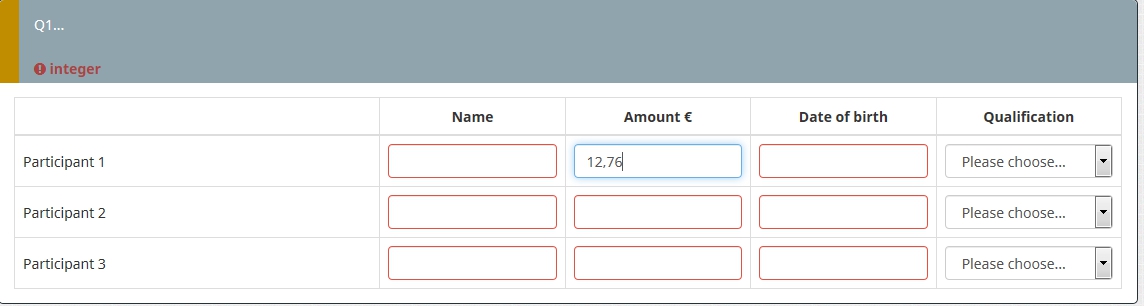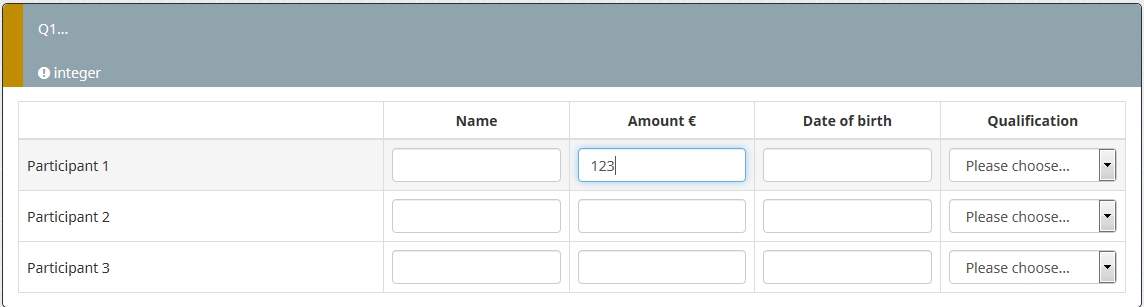 <script type="text/javascript" charset="utf-8"> $(document).on('ready pjax:scriptcomplete',function(){ var thisQuestion = $('#question{QID}'); // Column-specific classes $('tr.subquestion-list', thisQuestion).each(function(i) { $('th, td', this).each(function(i) { $(this).addClass('column-'+i); }); }); // Insert selects into column 1 if($('.answer-item.column-1 .inserted-select', thisQuestion).length == 0) { $('.answer-item.column-1', thisQuestion).addClass('with-select').append('<select class="inserted-select form-control list-question-select">\ <option value="">Please choose...</option>\ <option value="1">Yes</option>\ <option value="2">No</option>\ <option value="3">Do not know</option>\ </select>'); } // Listeners on select elements $('.inserted-select', thisQuestion).on('change', function(i) { if($(this).val() != '') { $(this).closest('.answer-item').find('input:text').val($.trim($('option:selected', this).text())).trigger('change'); } else { $(this).closest('.answer-item').find('input:text').val('').trigger('change'); } });