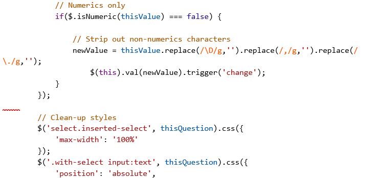 // Listener on column 2 inputs $('.answer-item.column-2 input:text', thisQuestion).on('keyup change', function(e) { var thisValue = $.trim($(this).val()); // Strip out non-numerics characters newValue = thisValue.replace(/\D/g,'').replace(/,/g,'').replace(/\./g,''); $(this).val(newValue).trigger('change'); });