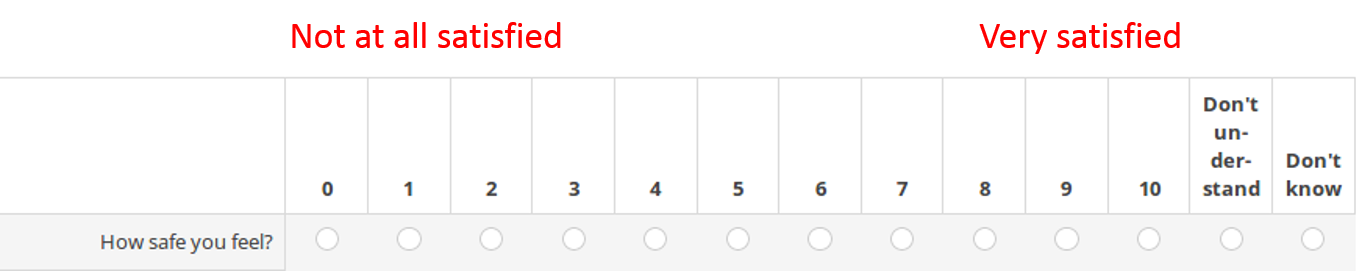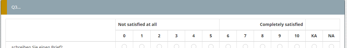 <script type="text/javascript" charset="utf-8"> $(document).on('ready pjax:scriptcomplete',function(){ // Insert the column categories $('#question{QID} table.subquestion-list thead tr:eq(0) td:eq(0)').remove(); $('#question{QID} table.subquestion-list thead').prepend('<tr class="ls-heading">\ <td rowspan="2" colspan="1"></td>\ <th colspan="6" style="text-align:left;">Not satisfied at all</th>\ <th colspan="5" style="text-align:right;">Completely satisfied</th>\ <td colspan="2"></td>\ </tr>'); }); </script>