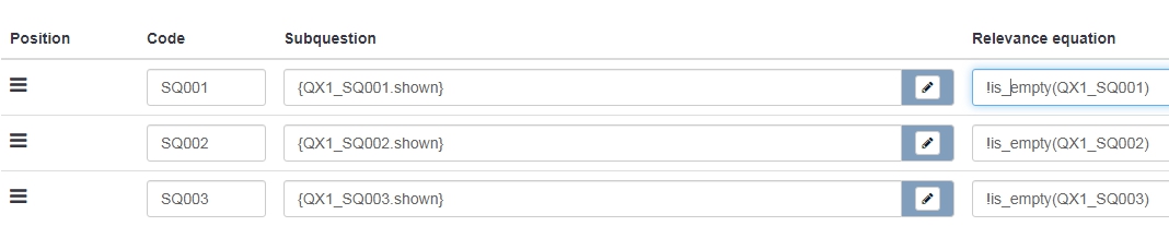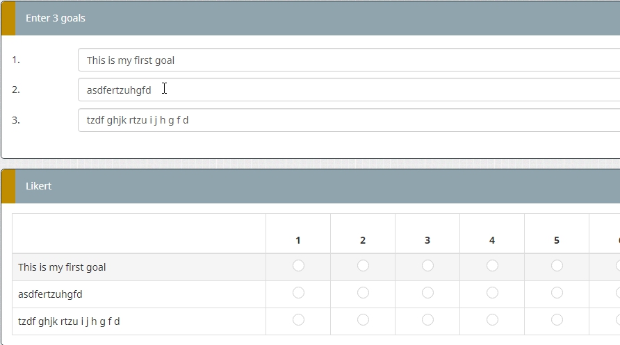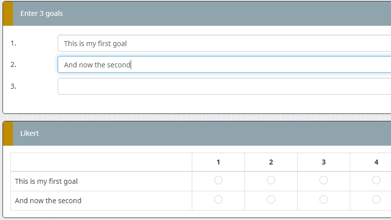 If the respondent is not forced to enter all 3 goals, there is a subquestion relevance equation that the item in the Likert scale is only displayed it there is text in the previous question.