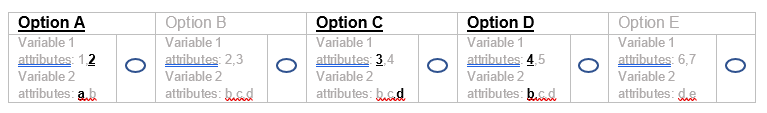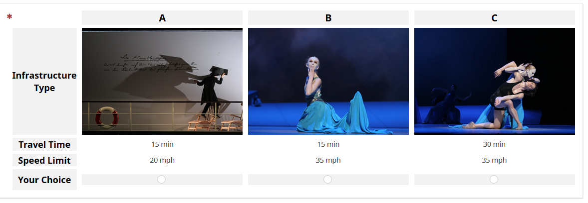 ,'35mph','40mph')))}</td><table border="0" cellpadding="0" cellspacing="0" style="border-collapse:collapse;"> <tbody> <tr> <td bgcolor="#f2f2f2" style="text-align: center;" width="0%"> </td> <td style="text-align: center;" width="1%"> </td> <td bgcolor="#f2f2f2" style="text-align: center;" width="25%"><strong><span style="color:#000000;"><span style="font-size:20px;">A</span></span></strong></td> <td style="text-align: center;" width="1%"> </td> <td bgcolor="#f2f2f2" style="text-align: center;" width="25%"><strong><span style="color:#000000;"><span style="font-size:20px;">B</span></span></strong></td> <td style="text-align: center;" width="1%"> </td> <td bgcolor="#f2f2f2" style="text-align: center;" width="25%"><strong><span style="color:#000000;"><span style="font-size:20px;">C</span></span></strong></td> </tr> <tr style="height: 6px; text-align: center;"> </tr> <tr> <td bgcolor="#f2f2f2" style="text-align: center;"><strong><span style="color:#000000;"><span style="font-size:18px;">Infrastructure Type</span></span></strong></td> <td style="text-align: center;" width="1%"> </td> <td><img src="/lime3/upload/surveys/877122/images/Hamburg-Ballett_{rImage1}.jpg" /></td> <td style="text-align: center;" width="1%"> </td> <td><img src="/lime3/upload/surveys/877122/images/Hamburg-Ballett_{rImage2}.jpg" /></td> <td style="text-align: center;" width="1%"> </td> <td><img src="/lime3/upload/surveys/877122/images/Hamburg-Ballett_{rImage3}.jpg" /></td> </tr> <tr style="height: 6px; text-align: center;"> </tr> <tr> <td bgcolor="#f2f2f2" style="text-align: center;"><strong><span style="color:#000000;"><span style="font-size:18px;">Travel Time</span></span></strong></td> <td style="text-align: center;" width="1%"> </td> <td style="text-align: center;">{if (randomTime1==1,'15 min',if(randomTime1==2,'20 min', if(randomTime1==3,'25 min', if(randomTime1==4,'30 min','35 min'))))}</td> <td style="text-align: center;" width="1%"> </td> <td style="text-align: center;">{if (randomTime2==1,'15 min',if(randomTime2==2,'20 min', if(randomTime2==3,'25 min', if(randomTime2==4,'30 min','35 min'))))}</td> <td style="text-align: center;" width="1%"> </td> <td style="text-align: center;">{if (randomTime3==1,'15 min',if(randomTime3==2,'20 min', if(randomTime3==3,'25 min', if(randomTime3==4,'30 min','35 min'))))}</td> </tr> <tr style="height: 6px; text-align: center;"> </tr> <tr> </tr> <tr> <td bgcolor="#f2f2f2" style="text-align: center;"><strong><span style="color:#000000;"><span style="font-size:18px;">Speed Limit</span></span></strong></td> <td style="text-align: center;" width="1%"> </td> <td style="text-align: center;">{if (randomSpeed1==1,'20 mph',if(randomSpeed1==2,'25 mph', if(randomSpeed1==3,'35 mph','40 mph')))}</td> <td style="text-align: center;" width="1%"> </td> <td style="text-align: center;">{if (randomSpeed2==1,'20 mph',if(randomSpeed2==2,'25 mph', if(randomSpeed2==3,'35 mph','40 mph')))}</td> <td style="text-align: center;" width="1%"> </td> <td style="text-align: center;">{if (randomSpeed3==1,'20 mph',if(randomSpeed3==2,'25 mph', if(randomSpeed3==3,'35 mph','40 mph')))}</td> </tr> <tr style="height: 6px; text-align: center;"> </tr> <tr> <td bgcolor="#f2f2f2" style="text-align: center;"><strong><span style="font-size:18px;"><span style="color:#000000;">Your Choice</span></span></strong></td> <td style="text-align: center;" width="0%"> </td> <td bgcolor="#f2f2f2" style="text-align: center;"> </td> <td style="text-align: center;" width="0%"> </td> <td bgcolor="#f2f2f2" style="text-align: center;"> </td> <td style="text-align: center;" width="0%"> </td> <td bgcolor="#f2f2f2" style="text-align: center;"> </td> </tr> </tbody> </table> <script type="text/javascript" charset="utf-8"> $(document).on('ready pjax:scriptcomplete',function(){ // Identify this question var thisQuestion = $('#question{QID}'); // Move the radios $('.question-text table:eq(0) tr:last td:eq(2)', thisQuestion).append($('.subquestion-list .answers-list:eq(0) .answer-item:eq(0) *', thisQuestion)); $('.question-text table:eq(0) tr:last td:eq(4)', thisQuestion).append($('.subquestion-list .answers-list:eq(0) .answer-item:eq(1) *', thisQuestion)); $('.question-text table:eq(0) tr:last td:eq(6)', thisQuestion).append($('.subquestion-list .answers-list:eq(0) .answer-item:eq(2) *', thisQuestion)); // Some classes for presentation $('.question-text table:eq(0) input:radio', thisQuestion).closest('td').addClass('answer-item radio-item text-center radio'); $('.question-text table:eq(0) .radio-item label', thisQuestion).show(); // Click event on the table cells $('.question-text table:eq(0) .radio-item', thisQuestion).on('click', function(e) { $('input:radio', this).trigger('click'); }); $('.question-text table:eq(0) input:radio', thisQuestion).on('click', function(e) { e.stopPropagation(); }); // Clean-up styles $('.answer-container', thisQuestion).hide(); $('.question-text table:eq(0) .label-text', thisQuestion).remove(); $('.question-text table:eq(0) .radio-text', thisQuestion).css({ 'cursor': 'pointer' }); }); </script>