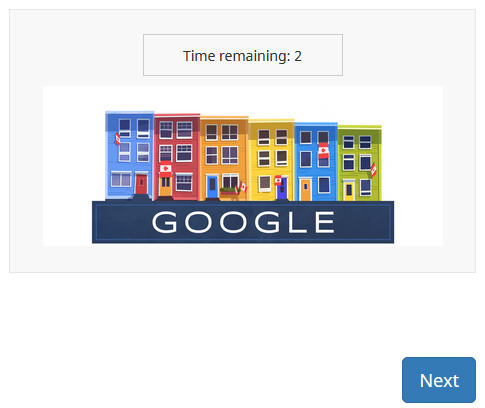 <div class="timer" style="padding: 10px; border: 1px solid #CCC; margin: 10px auto; width: 200px; text-align: center;"> Time remaining: <span class="time"></span> </div> <p style="text-align:center;"> <img src="https://www.google.com/logos/doodles/2020/canada-day-2020-6753651837108439-2x.jpg" style="max-width: 400px;" /> </p> <script type="text/javascript" charset="utf-8"> $(document).on('ready pjax:scriptcomplete',function(){ var delay = 10; // Delay time in seconds $('#question{QID} span.time').text(delay); var submitTimer = setInterval(function() { delay--; $('#question{QID} span.time').text(delay); if(delay == 0) { clearInterval(submitTimer); $('#question{QID} .question-text img').fadeOut(); $('#ls-button-submit').trigger('click'); } }, 1000); }); </script>