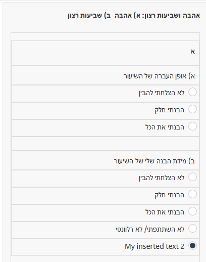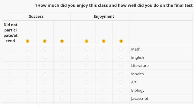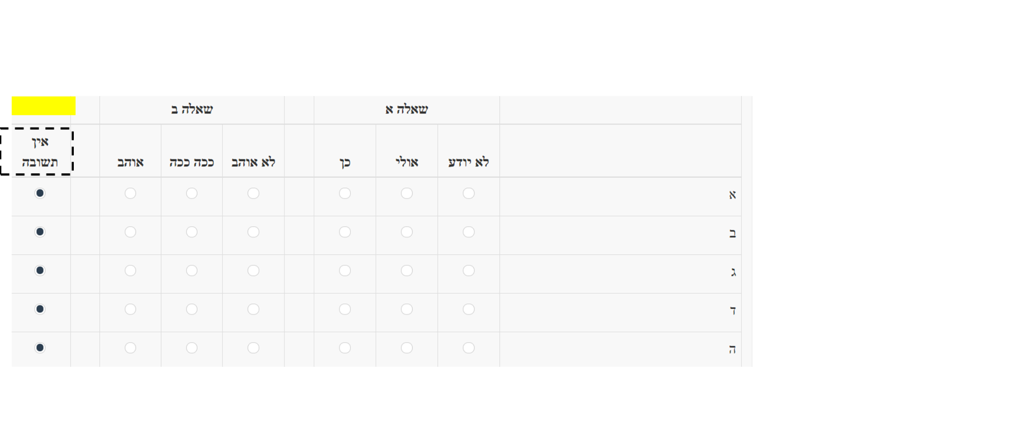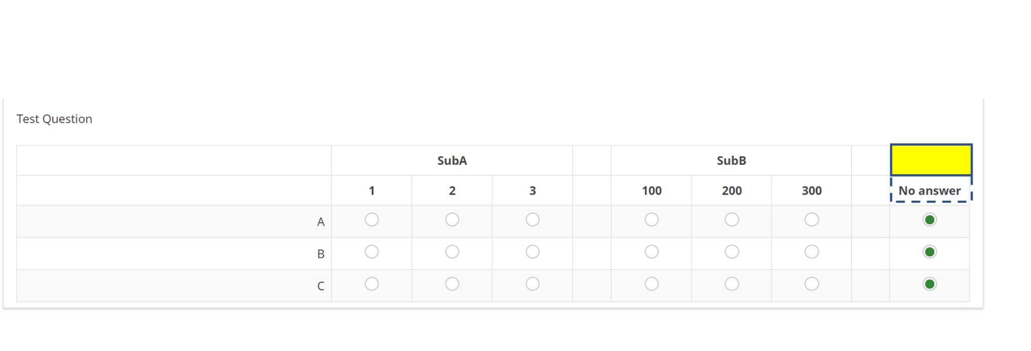 Can you attach a small sample survey (.lss file) containing only the relevant question?I am working in RTL, so the outline and highlighted text are the "no answer" option column. This would be the far right column in English, LTR. Javascript is enabled and other source manipulations do work. I think the issue is that last-child is not the correct reference to the no answer column, but I am not sure.