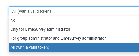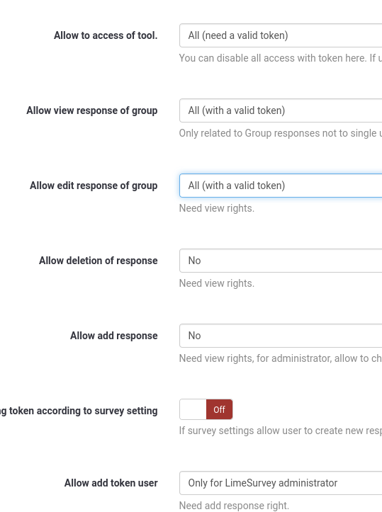 About group and group manager : usage of attributesjakeoh wrote: "With survey with token table : you can set group and group manager. Then participant can view, add, update response. According to survey settings about anonymous, token answer persistance and allow multiple response."