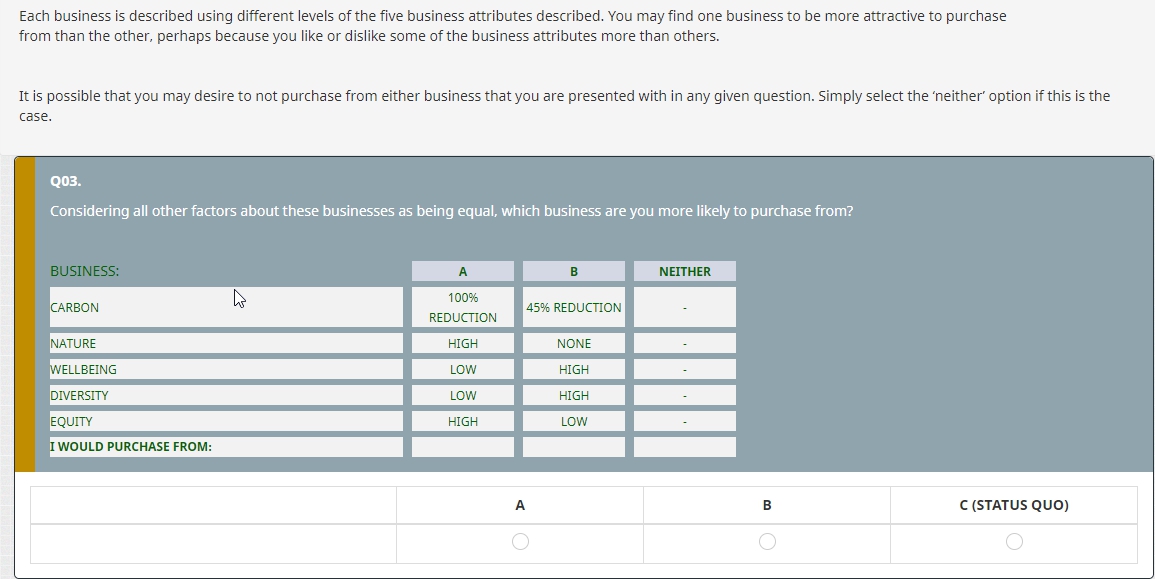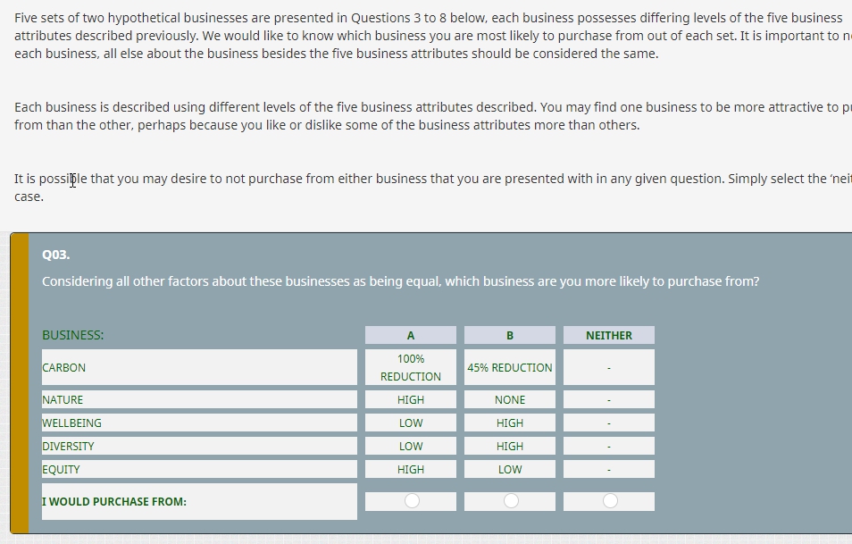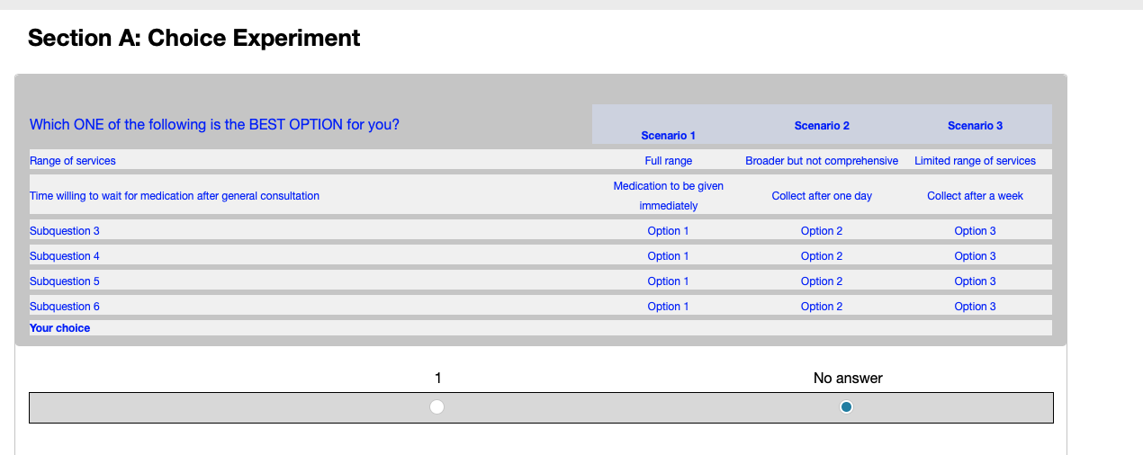 <table border="0" cellpadding="0" cellspacing="0" style="border-collapse:collapse;color:blue"> <tbody> <tr> <td style="text-align: left;" width="0%">Which ONE of the following is the BEST OPTION for you? </td> <td style="text-align: center;" width="0%"> </td> <td bgcolor="#D4D7E4" style="text-align: center;" width="15%"><br /><span style="font-size:12px;"><strong>Scenario 1</strong></span><br /> </td> <td style="text-align: center;" width="0%"> </td> <td bgcolor="#D4D7E4" style="text-align: center;" width="15%"><span style="font-size:12px;"><strong>Scenario 2</strong></span></td> <td style="text-align: center;" width="0%"> </td> <td bgcolor="#D4D7E4" style="text-align: center;" width="15%"><span style="font-size:12px;"><strong>Scenario 3</strong></span></td> </tr> <tr style="height: 6px; text-align: center;"> </tr> <tr> <td bgcolor="#f2f2f2" style="text-align: left;"><span style="font-size:12px;">Range of services</span></td> <td style="text-align: center;" width="0%"> </td> <td bgcolor="#f2f2f2" style="text-align: center;"> <div><span style="font-size:12px;">Full range</span></div> </td> <td style="text-align: center;" width="0%"> </td> <td bgcolor="#f2f2f2" style="text-align: center;"><span style="font-size:12px;">Broader but not comprehensive</span></td> <td style="text-align: center;" width="0%"> </td> <td bgcolor="#f2f2f2" style="text-align: center;"><span style="font-size:12px;">Limited range of services</span></td> </tr> <tr style="height: 6px; text-align: center;"> </tr> <tr> <td bgcolor="#f2f2f2" style="text-align: left;"><span style="font-size:12px;">Time willing to wait for medication after general consultation</span></td> <td style="text-align: center;" width="0%"> </td> <td bgcolor="#f2f2f2" style="text-align: center;"><span style="font-size:12px;">Medication to be given immediately</span></td> <td style="text-align: center;" width="0%"> </td> <td bgcolor="#f2f2f2" style="text-align: center;"><span style="font-size:12px;">Collect after one day</span></td> <td style="text-align: center;" width="0%"> </td> <td bgcolor="#f2f2f2" style="text-align: center;"><span style="font-size:12px;">Collect after a week</span></td> </tr> <tr style="height: 6px; text-align: center;"> </tr> <tr> <td bgcolor="#f2f2f2" style="text-align: left;"><span style="font-size:12px;">Subquestion 3</span></td> <td style="text-align: center;" width="0%"> </td> <td bgcolor="#f2f2f2" style="text-align: center;"><span style="font-size:12px;">Option 1</span></td> <td style="text-align: center;" width="0%"> </td> <td bgcolor="#f2f2f2" style="text-align: center;"><span style="font-size:12px;">Option 2</span></td> <td style="text-align: center;" width="0%"> </td> <td bgcolor="#f2f2f2" style="text-align: center;"><span style="font-size:12px;">Option 3</span></td> </tr> <tr style="height: 6px; text-align: center;"> </tr> <tr> <td bgcolor="#f2f2f2" style="text-align: left;"><span style="font-size:12px;">Subquestion 4</span></td> <td style="text-align: center;" width="0%"> </td> <td bgcolor="#f2f2f2" style="text-align: center;"><span style="font-size:12px;">Option 1</span></td> <td style="text-align: center;" width="0%"> </td> <td bgcolor="#f2f2f2" style="text-align: center;"><span style="font-size:12px;">Option 2</span></td> <td style="text-align: center;" width="0%"> </td> <td bgcolor="#f2f2f2" style="text-align: center;"><span style="font-size:12px;">Option 3</span></td> </tr> <tr style="height: 6px; text-align: center;"> </tr> <tr> <td bgcolor="#f2f2f2" style="text-align: left;"><span style="font-size:12px;">Subquestion 5</span></td> <td style="text-align: center;" width="0%"> </td> <td bgcolor="#f2f2f2" style="text-align: center;"><span style="font-size:12px;">Option 1</span></td> <td style="text-align: center;" width="0%"> </td> <td bgcolor="#f2f2f2" style="text-align: center;"><span style="font-size:12px;">Option 2</span></td> <td style="text-align: center;" width="0%"> </td> <td bgcolor="#f2f2f2" style="text-align: center;"><span style="font-size:12px;">Option 3</span></td> </tr> <tr style="height: 6px; text-align: center;"> </tr> <tr> <td bgcolor="#f2f2f2" style="text-align: left;"><span style="font-size:12px;">Subquestion 6</span></td> <td style="text-align: center;" width="0%"> </td> <td bgcolor="#f2f2f2" style="text-align: center;"><span style="font-size:12px;">Option 1</span></td> <td style="text-align: center;" width="0%"> </td> <td bgcolor="#f2f2f2" style="text-align: center;"><span style="font-size:12px;">Option 2</span></td> <td style="text-align: center;" width="0%"> </td> <td bgcolor="#f2f2f2" style="text-align: center;"><span style="font-size:12px;">Option 3</span></td> </tr> <tr style="height: 6px; text-align: center;"> </tr> <tr> <td bgcolor="#f2f2f2" style="text-align: left;font-size:12px;font-weight:bold">Your choice </td> <td style="text-align: center;" width="0%"> </td> <td bgcolor="#f2f2f2" style="text-align: center;"> </td> <td style="text-align: center;" width="0%"> </td> <td bgcolor="#f2f2f2" style="text-align: center;"> </td> <td style="text-align: center;" width="0%"> </td> <td bgcolor="#f2f2f2"> </td> </tr> </tbody> </table>