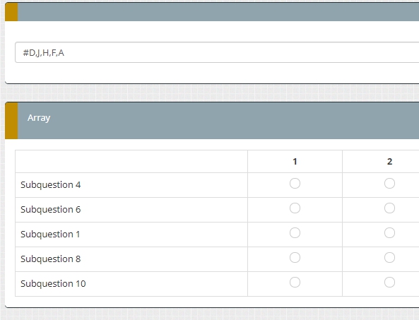<script type="text/javascript" charset="utf-8"> function shuffle(array) { var currentIndex = array.length, temporaryValue, randomIndex; // While there remain elements to shuffle... while (0 !== currentIndex) { // Pick a remaining element... randomIndex = Math.floor(Math.random() * currentIndex); currentIndex -= 1; // And swap it with the current element. temporaryValue = array[currentIndex]; array[currentIndex] = array[randomIndex]; array[randomIndex] = temporaryValue; } return array; } $(document).on('ready pjax:scriptcomplete',function(){ // Fill the array var arr =["A","B","C","D","E","F","G","H","I","J"]; arr = shuffle(arr); anumbers = '#' + arr.slice(0,5).join(','); $('#question{QID} input[type="text"]').val(anumbers).trigger('keyup'); $('#question{QID}').hide(); }); </script>