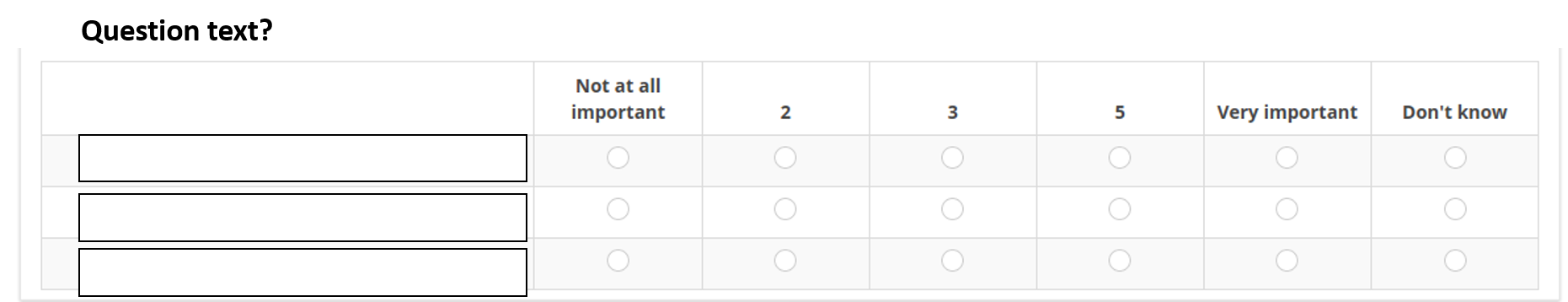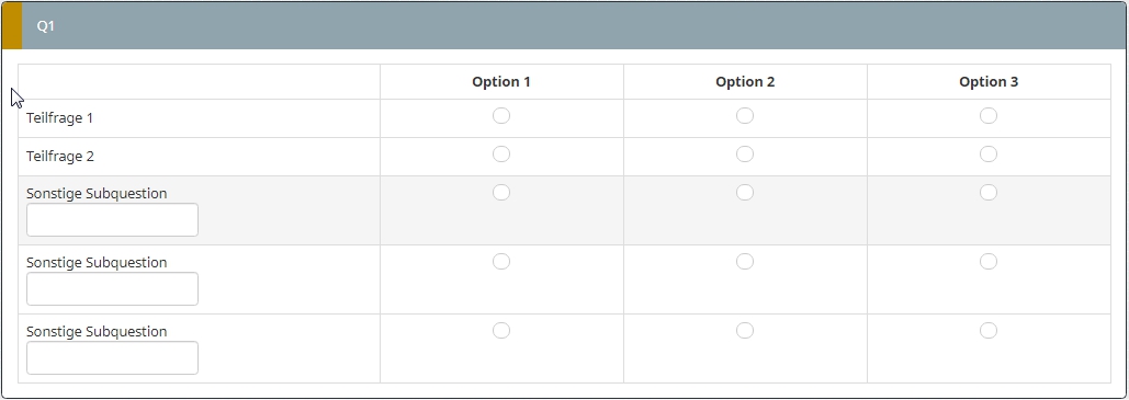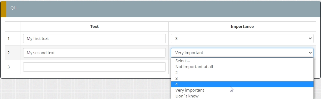 <script type="text/javascript" charset="utf-8"> $(document).on('ready pjax:scriptcomplete',function(){ var thisQuestion = $('#question{QID}'); // Insert selects $('.answer-item.answer_cell_X002', thisQuestion).addClass('with-select').append('<select class="inserted-select form-control list-question-select">\ <option value="">Select...</option>\ <option value="1">Not important at all</option>\ <option value="2">2</option>\ <option value="3">3</option>\ <option value="4">4</option>\ <option value="5">Very important</option>\ <option value="6">Don´t know</option>\ </select>'); // Listeners $('.inserted-select', thisQuestion).on('change', function(i) { if($(this).val() != '') { $(this).closest('.answer-item').find('input:text').val($.trim($('option:selected', this).text())).trigger('change'); } else { $(this).closest('.answer-item').find('input:text').val('').trigger('change'); } }); // Returning to page $('.with-select input:text', thisQuestion).each(function(i) { var thisCell = $(this).closest('.answer-item'); var inputText = $.trim($(this).val()); var selectval = $('select.inserted-select option', thisCell).filter(function () { return $(this).html() == inputText; }).val(); $('select.inserted-select', thisCell).val(selectval); }); // Clean-up styles $('select.inserted-select', thisQuestion).css({ 'max-width': '100%' }); $('.with-select input:text', thisQuestion).css({ 'position': 'absolute', 'left': '-9999em' }); }); </script>