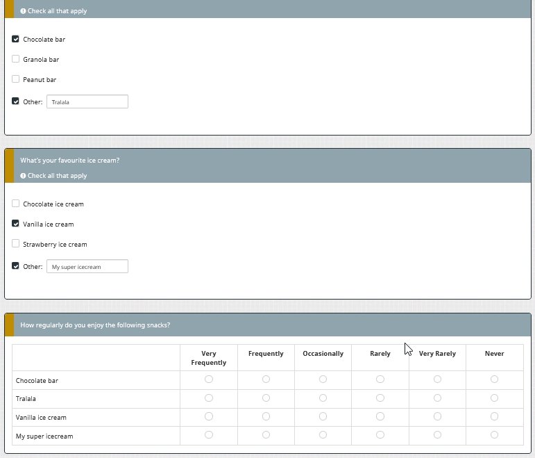 I have two multiple choice questions and want to populate a third array question with the multiple choice answers including any provided other options. Since the identifier "other" is predefined I don't know how to adress more than one other option, unfortunately.