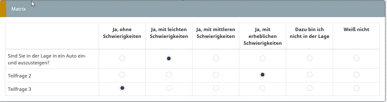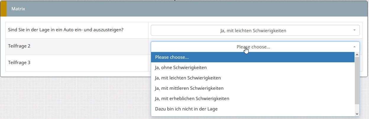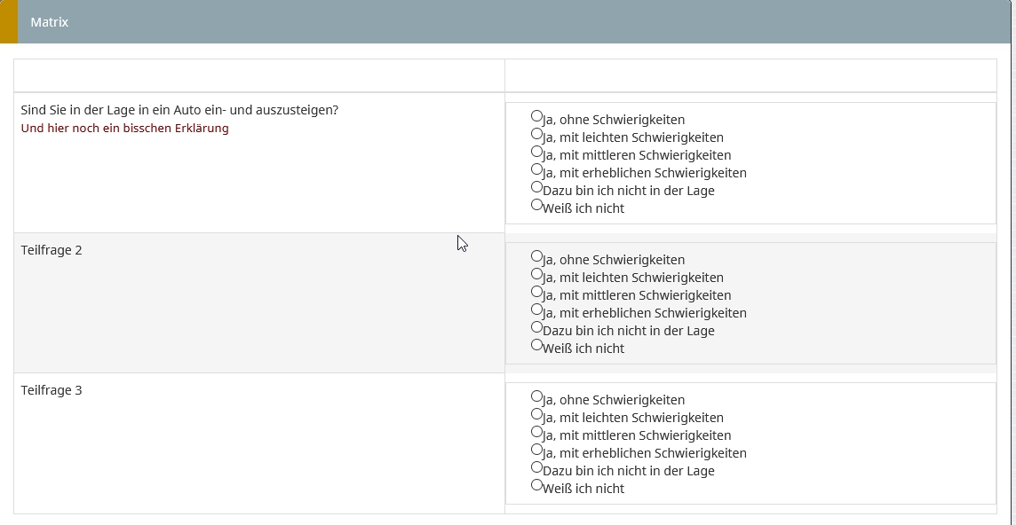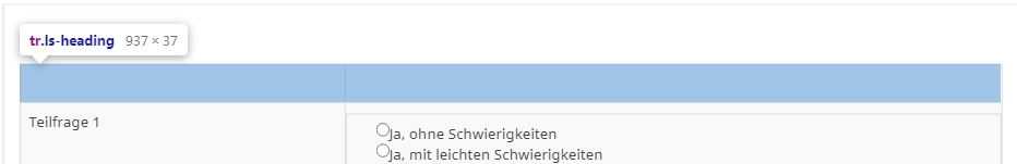 <script type="text/javascript" charset="utf-8"> $(document).ready(function(){ // Identify this question var thisQuestion = $('#question{QID}'); // Assign column-specific classes $('table.subquestion-list tr', thisQuestion).each(function(i) { $('> *:gt(0)', this).each(function(i){ $(this).addClass('column-'+(i+1)); $(this).attr('data-column', i+1); }); }); // Hide the text inputs in columns 1 $('.column-1 input[type="text"]', thisQuestion).hide(); // Loop through all column-1 inputs $('.answer-item.column-1 input[type="text"]', thisQuestion).each(function(i) { var thisID = $(this).attr('id'); var thisValue = $(this).val(); // Insert the radios $(this).parent().addClass('radio').append('<span class="inserted-radio-wrapper">\ <input id="'+thisID+'-1" class="radio" value="1" name="'+thisID.replace(/answer/, '')+'_radio" type="radio">\ <label class="control-label radio-label" for="'+thisID+'-1">Ja, ohne Schwierigkeiten</label>\ </span><br/>\ <span class="inserted-radio-wrapper">\ <input id="'+thisID+'-2" class="radio" value="2" name="'+thisID.replace(/answer/, '')+'_radio" type="radio">\ <label class="control-label radio-label" for="'+thisID+'-2">Ja, mit leichten Schwierigkeiten</label>\ </span><br/>\ <span class="inserted-radio-wrapper">\ <input id="'+thisID+'-3" class="radio" value="3" name="'+thisID.replace(/answer/, '')+'_radio" type="radio">\ <label class="control-label radio-label" for="'+thisID+'-3">Ja, mit mittleren Schwierigkeiten</label></span><br/>\ <span class="inserted-radio-wrapper">\ <input id="'+thisID+'-4" class="radio" value="4" name="'+thisID.replace(/answer/, '')+'_radio" type="radio">\ <label class="control-label radio-label" for="'+thisID+'-4">Ja, mit erheblichen Schwierigkeiten</label></span><br/>\ <span class="inserted-radio-wrapper">\ <input id="'+thisID+'-5" class="radio" value="5" name="'+thisID.replace(/answer/, '')+'_radio" type="radio">\ <label class="control-label radio-label" for="'+thisID+'-5">Dazu bin ich nicht in der Lage</label></span><br/>\ <span class="inserted-radio-wrapper">\ <input id="'+thisID+'-6" class="radio" value="6" name="'+thisID.replace(/answer/, '')+'_radio" type="radio">\ <label class="control-label radio-label" for="'+thisID+'-6">Weiß ich nicht</label>\ </span>'); // Initial radio states $(this).closest('td').find('input[type="radio"][value="'+thisValue+'"]').prop('checked', true); }); // Listener on the radios $('.answer-item.column-1 input[type="radio"]', thisQuestion).on('click', function() { var thisInput = $(this).closest('td').find('input[type="text"]'); $(this).closest('td').find('input[type="text"]').val($(this).val()); checkconditions($(thisInput).val(), $(thisInput).attr('name'), 'text'); }); // Some clean-up styles for the radios (could be placed in template.css) $('thead th, .answer-item.column-1', thisQuestion).css({ 'text-align': 'left', 'margin-left': '0px' }); $('.answer-item.column-1 .inserted-radio-wrapper', thisQuestion).css({ 'display': 'inline-block', 'margin': '0px 0px 0 0px', 'padding-left':'20px' }); $('.answer-item.column-1 label', thisQuestion).css({ 'padding': '0' }); $('.ls-answers tbody .answertext', thisQuestion).css({ 'text-align': 'left', 'vertical-align': 'top' }); $('.answer-item.column-1 .radio-label', thisQuestion).css({ 'padding-left': '3px', 'margin-right': '3px', 'padding':'0px 0px 0px 3px', 'margin-left':'10px' }); // Fix up the row background colours var rowIndex = 0; $('table.subquestion-list tbody tr', thisQuestion).each(function(i){ rowIndex ++; $(this).removeClass('array1, array2'); if(rowIndex % 2 == 0) { $(this).addClass('array1'); } else { $(this).addClass('array2'); } }); }); </script>