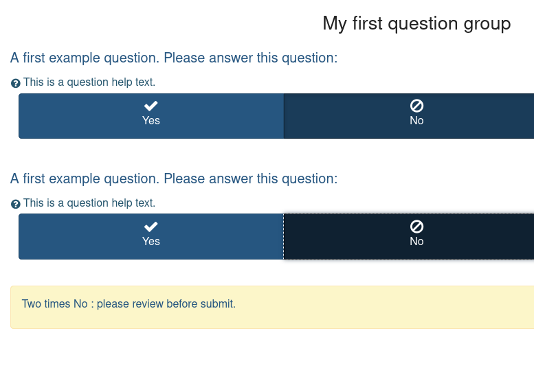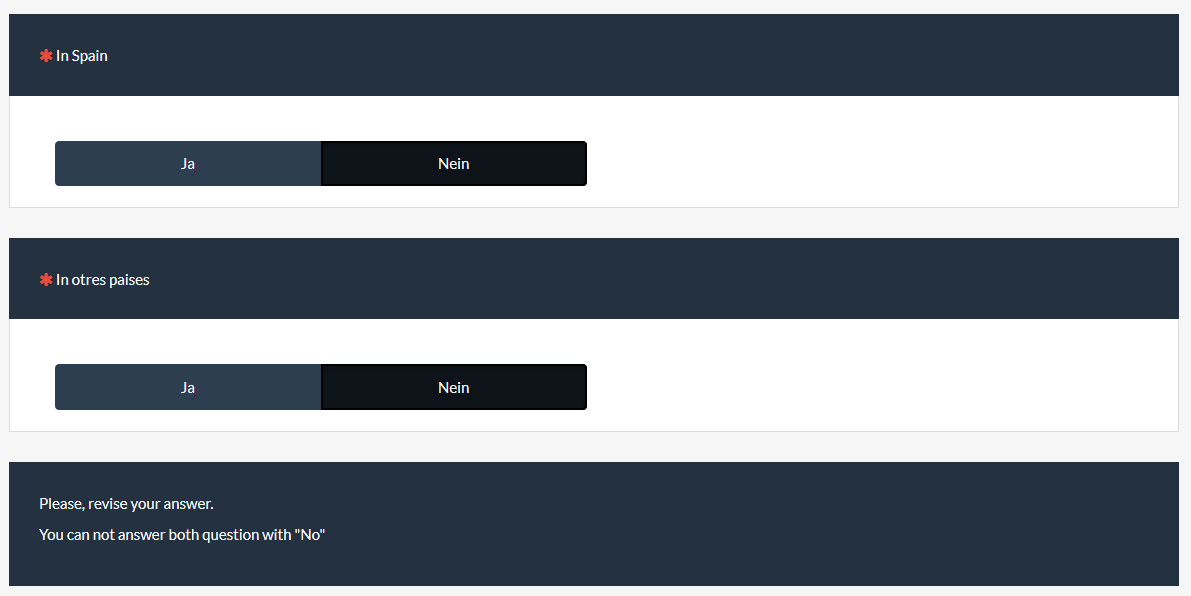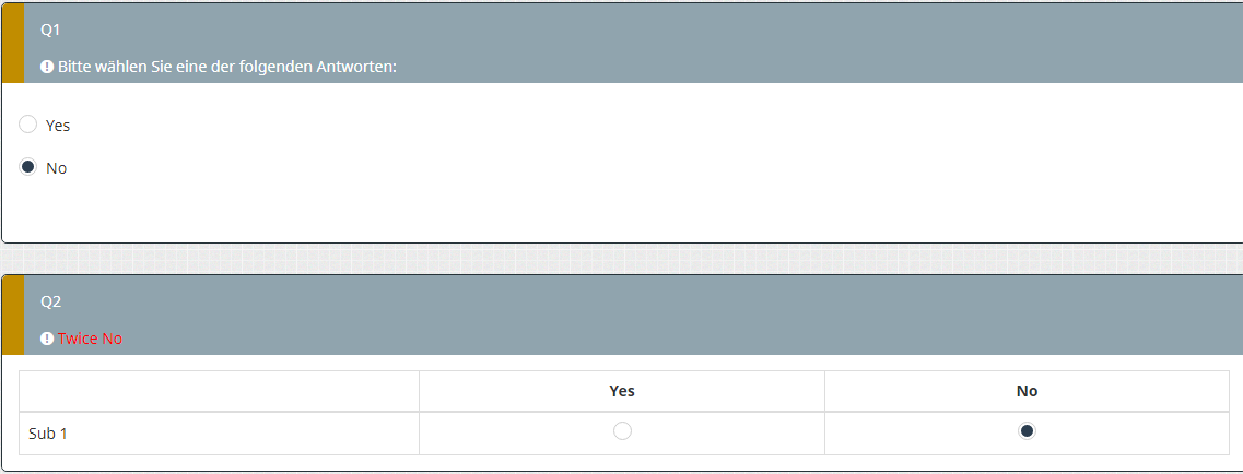 {if(Q5A=="N" and Q2_SQ001==Code of No,"<span style='color:red'>You have selected NO on this question and on a previous question, please, make sure that is right</span>","That's fine")}