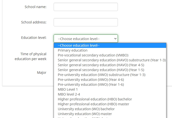 <script type="text/javascript" charset="utf-8"> $(document).on('ready pjax:complete',function() { alert(0); var qID = {QID}; var inputNum = 4; // Define the select element (dropdown) var prov1 = '<select id="prov1" class="form-control">\ <option value="">--Please, select--</option>\ <option value="1">Primary education</option>\ <option value="2">Pre-vocational secondary education (VMBO)</option>\ <option value="3">Senior general secondary education (HAVO) substructure (Year 1-3)</option>\ <option value="4">Senior general secondary education (HAVO) (Year 4-5)</option>\ <option value="5">Senior general secondary education (HAVO) (Year 1-5)</option>\ <option value="6">Pre-university education (VWO) substructure (Year 1-3)</option>\ <option value="7">Pre-university education (VWO) (Year 4-6) </option>\ <option value="7">Pre-university education (VWO) (Year 1-6) </option>\ <option value="8">MBO Level 1</option>\ <option value="9">MBO level 2-4</option>\ <option value="10">Higher professional education (HBO) bachelor</option>\ <option value="11">Higher professional education (HBO) master</option>\ <option value="12">University education (WO) bachelor</option>\ <option value="13">University education (WO) master</option>\ <option value="14">University education (WO) doctor</option>\ <option value="15">Other education level</option>\ </select>'; // Hide the text input $('#question'+qID+' .question-item:eq('+(inputNum-1)+') input[type="text"]').hide(); // Insert the select elements if($('#question'+qID+' .question-item:eq('+(inputNum-1)+') select').length == 0) { $('#question'+qID+' .question-item:eq('+(inputNum-1)+') input[type="text"]').before(prov1); } // Initially select an option if the question has already been answered $('#question'+qID+' select').each(function(i) { if($.trim($(this).next('input[type="text"]').val()) != '') { $(this).val($.trim($(this).next('input[type="text"]').val())); } }); // Listener on the dropdowns - insert selected values into hidden text input $('#question'+qID+' select').change(function() { var thisInput = $(this).next('input[type="text"]'); $(thisInput).val($(this).val()); checkconditions($(thisInput).attr('value'), $(thisInput).attr('name'), 'text'); }); // Some styles $('#question'+qID+' select').css({ 'margin':'0.3em 0 0 0' }); }); </script>