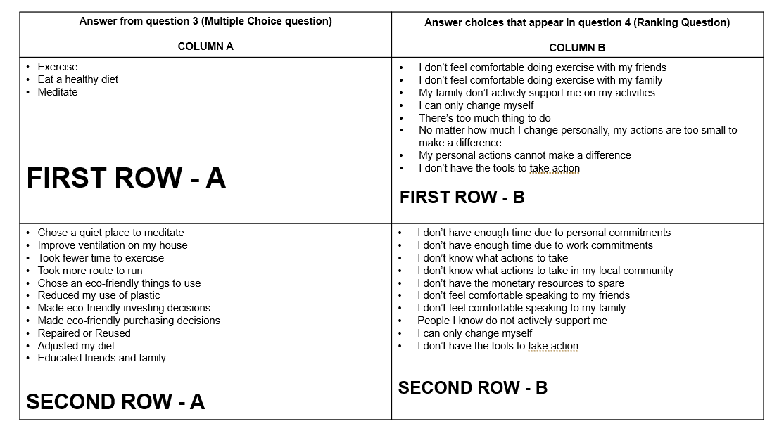 (I've used Ranking question for column B because they have to select their top 3 most applicable actions)