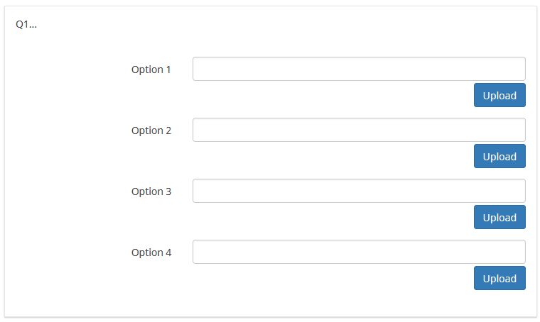 <script type="text/javascript" charset="utf-8"> $(document).on('ready pjax:scriptcomplete',function(){ // Identify the questions var thisQID = {QID}; var thisQuestion = $('#question'+thisQID); var subquestionsLength = $('.answer-item', thisQuestion).length; var qUploads = thisQuestion.nextAll('.upload-files:lt('+subquestionsLength+')'); // Add some classes $(qUploads).each(function(i) { $(this).addClass('uploads-question index-'+i).css({ 'position': 'absolute', 'left': '-9999em' }); }); // Insert the uploads buttons $('.answer-item', thisQuestion).each(function(i) { $('input:text', this).after('<button type="button" class="btn btn-primary" data-bs-toggle="modal" data-bs-target="#uploads-'+thisQID+'-'+(i+1)+'" data-backdrop="static" data-keyboard="false">Upload</button>'); }); // Handle uploads questions $(qUploads).each(function(i) { // Create modals $('body').append('<div class="modal uploads-modal" id="uploads-'+thisQID+'-'+(i+1)+'" tabindex="-1" role="dialog">\ <div class="modal-dialog" role="document">\ <div class="modal-content">\ <div class="modal-header">\ <h5 class="modal-title">'+$('.ls-label-question', this).html()+'</h5>\ </div>\ <div class="modal-body">\ </div>\ <div class="modal-footer">\ <button type="button" class="btn btn-primary" data-bs-dismiss="modal">Close</button>\ </div>\ </div>\ </div>\ </div>'); // Move the Upload questions into modals $('#uploads-'+thisQID+'-'+(i+1)+' .modal-body').append($('.ls-answers', this)); }); // Interrupt the Next/Submit function (to put comments back in the form) $('#limesurvey').submit(function(e) { $('.uploads-modal[id^="uploads-'+thisQID+'-"]').each(function(i) { var qID = $('input:eq(0)', this).attr('id').split('X')[2]; $('#question'+qID+' .answer-container').append($('.ls-answers', this)); }); }); }); </script>
