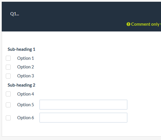 <script type="text/javascript" charset="utf-8"> $(document).ready(function() { var thisQuestion = $('#question{QID}'); // Remove some text inputs $('.checkbox-text-item:eq(0) .comment-item', thisQuestion).remove(); $('.checkbox-text-item:eq(1) .comment-item', thisQuestion).remove(); $('.checkbox-text-item:eq(2) .comment-item', thisQuestion).remove(); $('.checkbox-text-item:eq(3) .comment-item', thisQuestion).remove(); // Insert sub-headings $('.checkbox-text-item:eq(0)', thisQuestion).before('<li class="inserted-sub-heading">Sub-heading 1</li>'); $('.checkbox-text-item:eq(3)', thisQuestion).before('<li class="inserted-sub-heading">Sub-heading 2</li>'); }); </script>