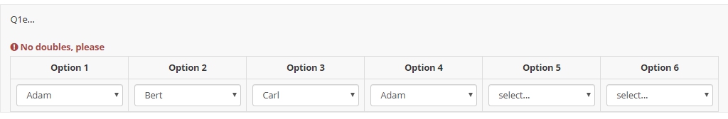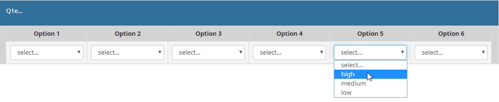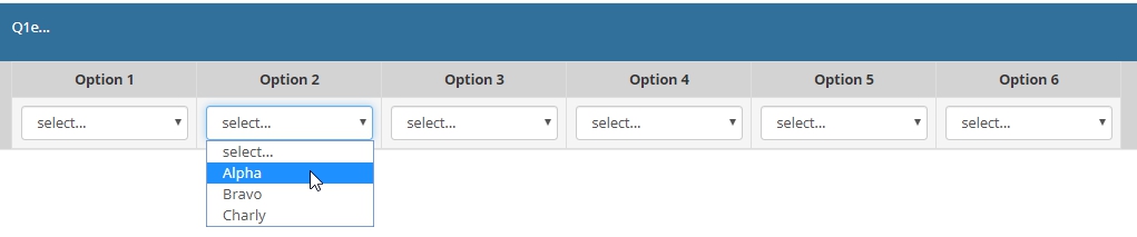 <script type="text/javascript" charset="utf-8"> $(document).on('ready pjax:scriptcomplete',function(){ var thisQuestion = $('#question{QID}'); // Insert selects $('.answer-item.answer_cell_X001', thisQuestion).addClass('with-select').append('<select class="inserted-select form-control list-question-select">\ <option value="">select...</option>\ <option value="1">Adam</option>\ <option value="2">Bert</option>\ <option value="3">Carl</option>\ </select>'); $('.answer-item.answer_cell_X002', thisQuestion).addClass('with-select').append('<select class="inserted-select form-control list-question-select">\ <option value="">select...</option>\ <option value="1">Alpha</option>\ <option value="2">Bravo</option>\ <option value="3">Charly</option>\ </select>'); $('.answer-item.answer_cell_X003', thisQuestion).addClass('with-select').append('<select class="inserted-select form-control list-question-select">\ <option value="">select...</option>\ <option value="1">One</option>\ <option value="2">Two</option>\ <option value="3">Three</option>\ <option value="4">Four</option>\ <option value="5">Five</option>\ <option value="6">Six</option>\ <option value="7">Seven</option>\ <option value="8">Eight</option>\ <option value="9">Nine</option>\ <option value="10">Ten</option>\ </select>'); $('.answer-item.answer_cell_X004', thisQuestion).addClass('with-select').append('<select class="inserted-select form-control list-question-select">\ <option value="">select...</option>\ <option value="1">good</option>\ <option value="2">average</option>\ <option value="3">bad</option>\ </select>'); $('.answer-item.answer_cell_X005', thisQuestion).addClass('with-select').append('<select class="inserted-select form-control list-question-select">\ <option value="">select...</option>\ <option value="1">high</option>\ <option value="2">medium</option>\ <option value="3">low</option>\ </select>'); $('.answer-item.answer_cell_X006', thisQuestion).addClass('with-select').append('<select class="inserted-select form-control list-question-select">\ <option value="">select...</option>\ <option value="1">AAAA</option>\ <option value="2">BBBB</option>\ <option value="3">CCCC</option>\ <option value="4">DDDD</option>\ <option value="5">EEEE</option>\ </select>'); // Listeners $('.inserted-select', thisQuestion).on('change', function(i) { if($(this).val() != '') { $(this).closest('.answer-item').find('input:text').val($('option:selected', this).val()).trigger('change'); } else { $(this).closest('.answer-item').find('input:text').val('').trigger('change'); } }); // Returning to page $('.with-select input:text', thisQuestion).each(function(i) { var thisCell = $(this).closest('.answer-item'); var inputText = $.trim($(this).val()); $('select.inserted-select', thisCell).val(inputText); }); // Clean-up styles $('select.inserted-select', thisQuestion).css({ 'max-width': '100%' }); $('.with-select input:text', thisQuestion).css({ 'position': 'absolute', 'left': '-9999em' }); }); </script>