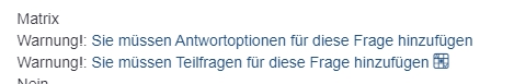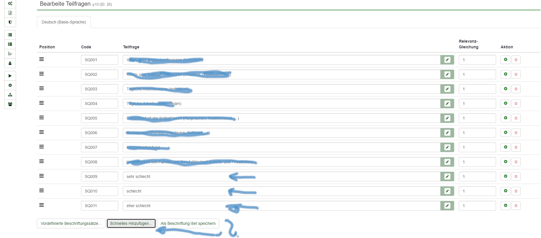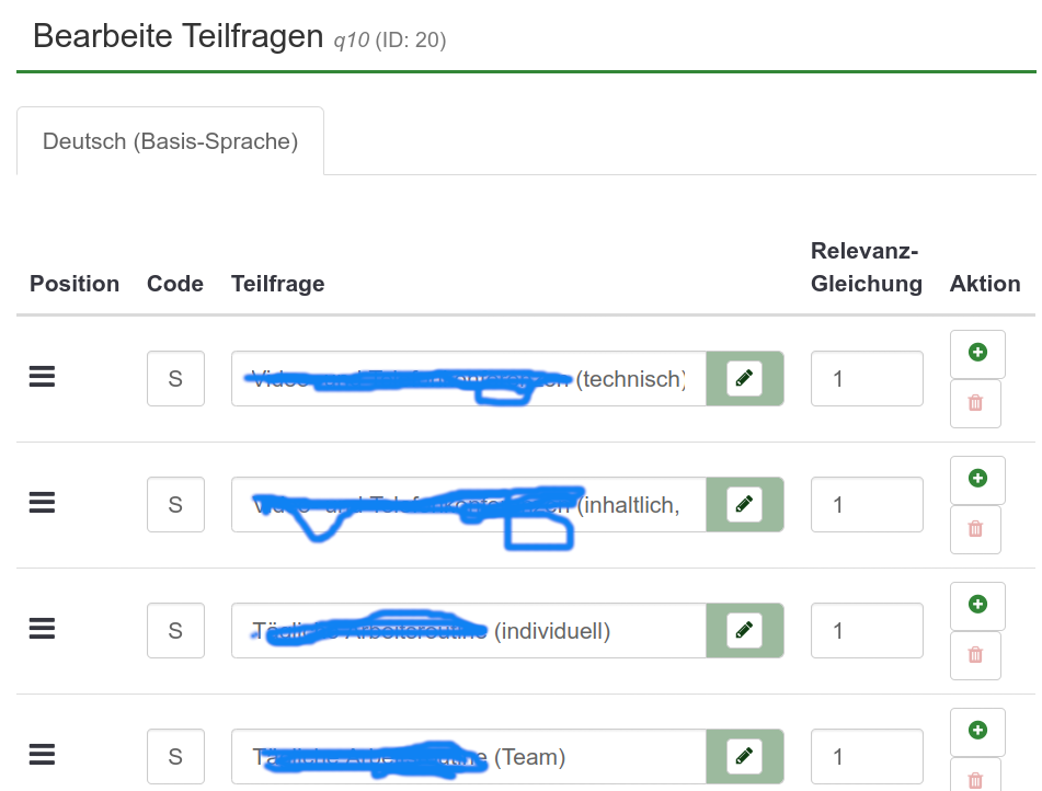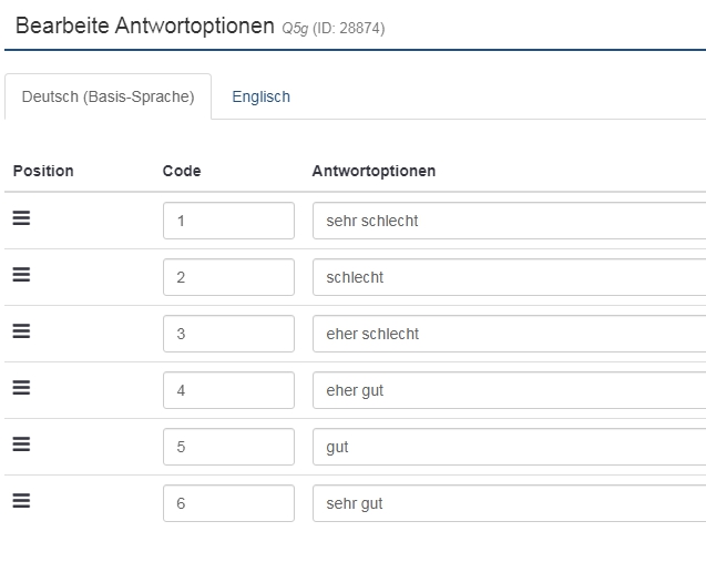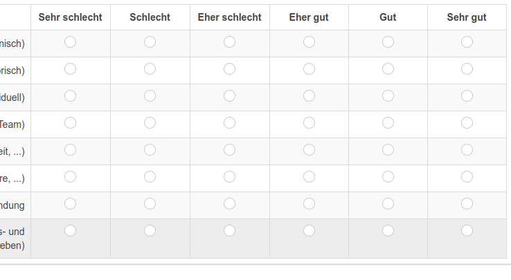 +------------------------------------------------------------------------+---------------+---------------+---------------+----------+----------+----------+ | Questions | Schlecht | Eher schlecht | Eher gut | Gut | Sehr gut | | +------------------------------------------------------------------------+---------------+---------------+---------------+----------+----------+----------+ | Question 1 | Sehr schlecht | Schlecht | Eher schlecht | Eher gut | Gut | Sehr gut | | Question 2 | Sehr schlecht | Schlecht | Eher schlecht | Eher gut | Gut | Sehr gut | Question 3 | Sehr schlecht | Schlecht | Eher schlecht | Eher gut | Gut | Sehr gut | | Question 4 | Sehr schlecht | Schlecht | Eher schlecht | Eher gut | Gut | Sehr gut | | Question 6 | Sehr schlecht | Schlecht | Eher schlecht | Eher gut | Gut | Sehr gut | | Question 7 | Sehr schlecht | Schlecht | Eher schlecht | Eher gut | Gut | Sehr gut | | Question 8 | Sehr schlecht | Schlecht | Eher schlecht | Eher gut | Gut | Sehr gut | | Question 9 | Sehr schlecht | Schlecht | | | | | +------------------------------------------------------------------------+---------------+---------------+---------------+----------+----------+----------+