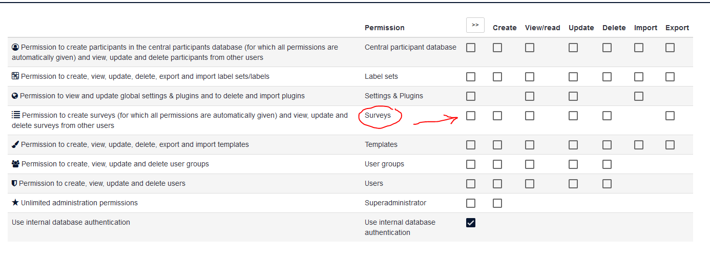 We are phasing out our Limesurvey use and we would like to keep existing surveys functioning and manageable but prevent users from creating new ones. Is there a way to do this in the settings?
