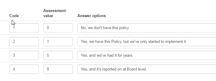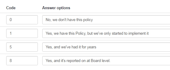 All our questions are similar, eg, "Do you have X Policy and if so, at what level?". People may answer as follows: