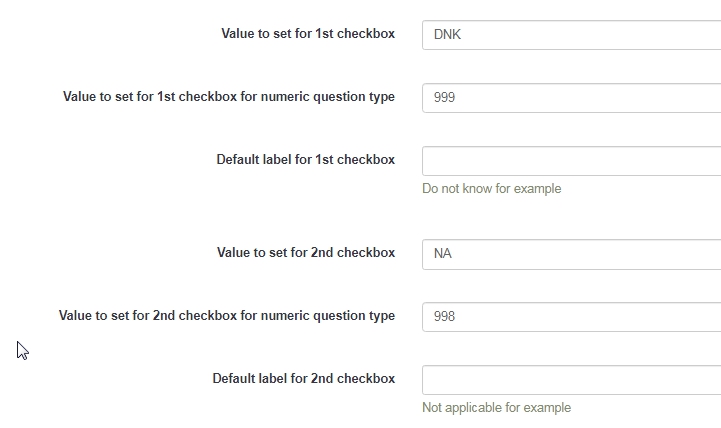 Question? <script type="text/javascript" charset="utf-8"> $(document).on('ready pjax:scriptcomplete',function(){ // Identify this question var thisQuestion = $('#question{QID}'); var lastInput = $('input:text:last', thisQuestion); var lastItem = $(lastInput).closest('div'); // Insert the check-box $(lastItem).addClass('checkbox-item with-inserted-checkbox').append('<input type="checkbox" name="insertedInput" id="insertedInput" value=""><label for="insertedInput" class="checkbox-label control-label"></label>'); // Listener on the checkbox $(':checkbox', lastItem).on('change', function(e) { if($(this).is(':checked')) { $('input:text', thisQuestion).not(lastInput).val('').trigger('keyup'); $(lastInput).val(100).trigger('keyup'); $('li.ls-group-dynamic', thisQuestion).hide(); } else { $('li.ls-group-dynamic', thisQuestion).show(); $(lastInput).val('').trigger('keyup'); } }); }); </script> <style type="text/css">.numeric-multi .with-inserted-checkbox input.form-control { position: absolute; left: -9999em; } .numeric-multi .with-inserted-checkbox label::before, .numeric-multi .with-inserted-checkbox label::after { margin: -7px 0 0 0; } </style>