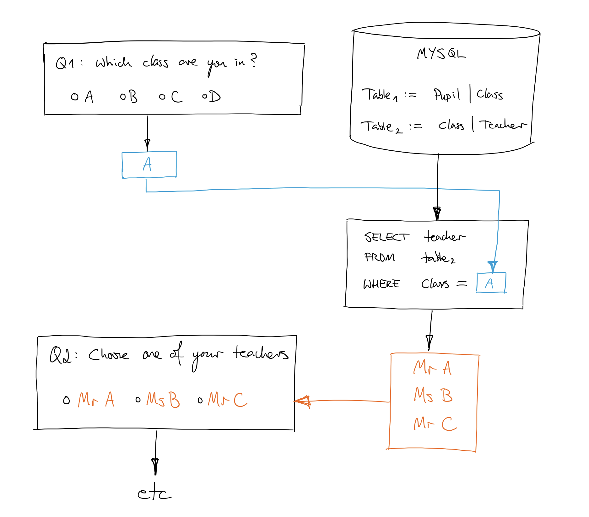 In your script "getTeacher.php" you do your queries and return the teachers.