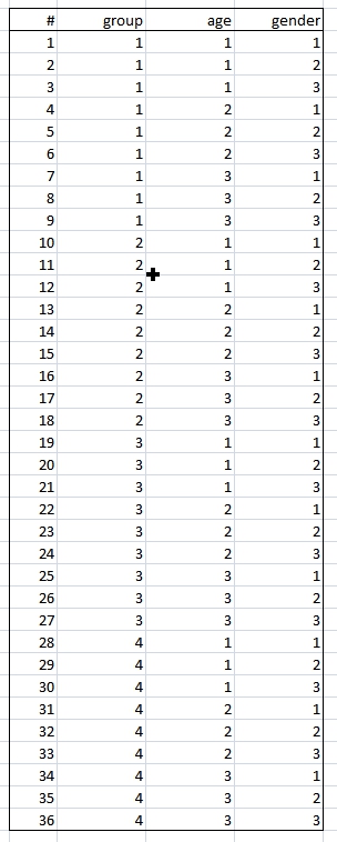 Next I created a question of type array(text) ("QGB") with 9 rows (all combinations of age and gender) and 4 columns.