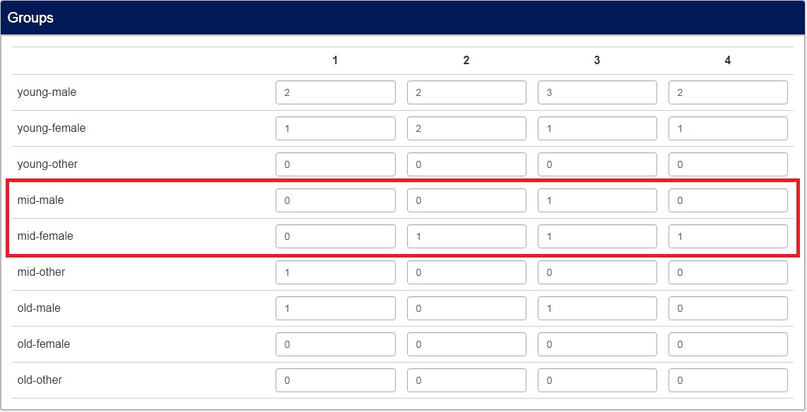 2. the next selected group of "mid-male" should be one of Group 1, 2 or 4.