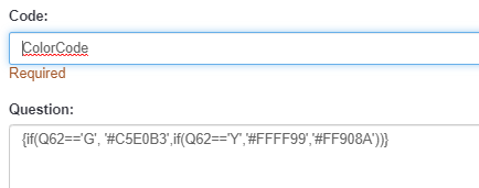 <table border="0" cellpadding="1" cellspacing="1" style="width:100%;"> <tbody> <tr> <td id="notice" style="background-color: red; text-align: center;"> <p> </p> <p> </p> <h1><strong>{if(Q62=="G","Contact is FIT for Travel",if(Q62=="Y","Additional Information Required","Contact is UNFIT for Travel"))}</strong></h1> <p> </p> </td> </tr> </tbody> </table> <script type="text/javascript"> var colr = {Q62}; if(colr = "G") { document.getElementById('notice').style.backgroundColor= '#00FF00'; }; </script>