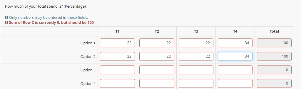 {if(sum(self.sq_a.NAOK)!=100,"Sum of Row A is currently "+sum(self.sq_a.NAOK)+", but should be 100",if(sum(self.sq_b.NAOK)!=100,"Sum of Row B is currently "+sum(self.sq_b.NAOK)+", but should be 100",if(sum(self.sq_c.NAOK)!=100,"Sum of Row C is currently "+sum(self.sq_c.NAOK)+", but should be 100",if(sum(self.sq_d.NAOK)!=100,"Sum of Row D is currently "+sum(self.sq_d.NAOK)+", but should be 100","Everything is fine"))))}