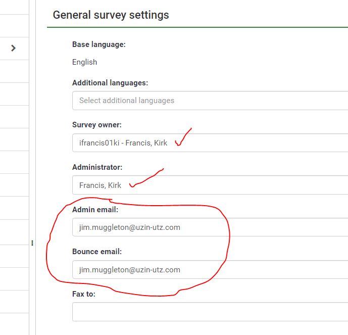 In "General Survey Settings" I have changed the "Admin. email:" address from my own as the "Survey owner:" to another individual in our organization who needs to now receive the notifications when a survey has been completed.... however, this individual is not receiving these emails from Lime Survey. Is this a glitch in the system or should the system recognize the new email address? See attachment showing me as Survey owner (Kirk Francis) and my colleague (Jim Muggleton) as the individual who I now want to receive notifications. Thanks.