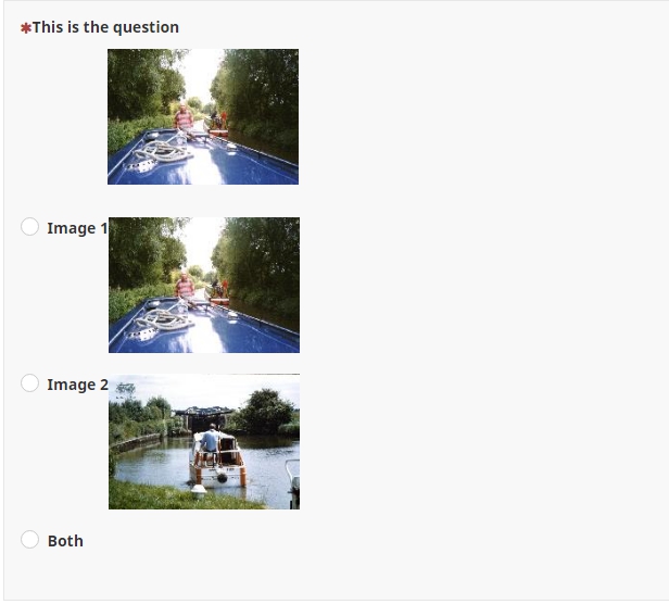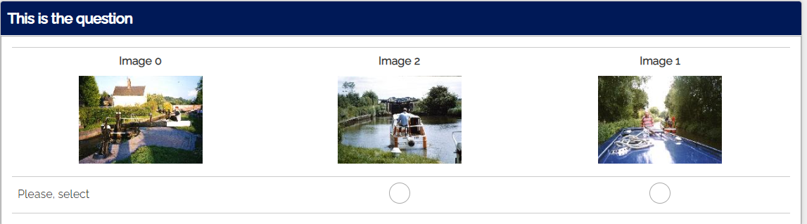 For this I have created three different questions (I don't know if that is sufficient). However, I want to make these comparisons, say, 10 times with randomized content. So the first question (M1VSM2) should be visualized 10 times with different content, then the second question (M1VSM2) 10 times with different content and the same for the third question. The different content means that I have 50 trios of images (img_orig_1, image_m1_1, and image_m2_1; img_orig_2, image_m1_2, and image_m2_2, ...), of which only 10 trios should be (randomly) displayed to users. For each trio I want to visualize all three images side by side and the order should be random again, except for the image img_orig_X (must always be the first image). So the following options should be possible [img_orig_X, image_m1_X, image_m2_X] and [img_orig_X, image_m2_X, image_m1_X]. The user should be able to select either the image in the middle or the image on the right (either image_m1_X or image_m2_X).