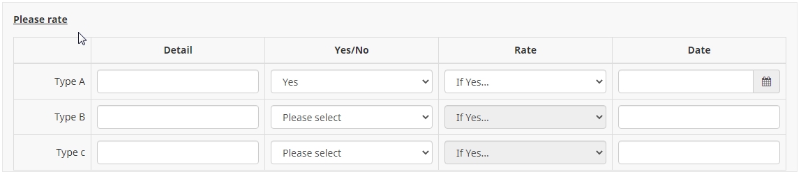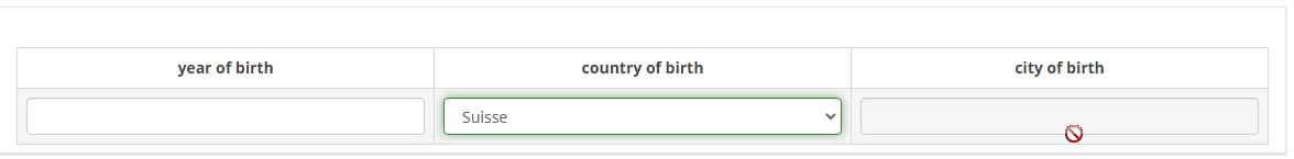 <script type="text/javascript" charset="utf-8"> $(document).on('ready pjax:scriptcomplete',function(){ var thisQuestion = $('#question{QID}'); // Insert selects into column 2 $(' .answer_cell_S2b1', thisQuestion).addClass('with-select').append('<select class="inserted-select form-control list-question-select">\ <option value="1">France</option>\ <option value="2">Allemagne</option>\ <option value="3">Suisse</option>\ <option value="4">Autre</option>\ </select>'); // Listeners on select elements $('.inserted-select', thisQuestion).on('change', function(i) { if($(this).val() != '') { $(this).closest('.answer-item').find('input:text').val($.trim($('option:selected', this).text())).trigger('change'); } else { $(this).closest('.answer-item').find('input:text').val('').trigger('change'); } // 3rd column conditional on 2nd column if($(this).closest('.answer-item').hasClass('answer_cell_S2b1')) { handleColumn3($(this)); } }); function handleColumn3(thisSelect) { var thisRow = $(thisSelect).closest('tr.subquestion-list'); var item3 = $('.answer_cell_S2b2', thisRow); if($(thisSelect).val() == '1') { $('input:text', item3).prop('disabled', false); } else { $('input:text', item3).val('').prop('disabled', true); // $('input:text', item3).val('').trigger('change'); } } // Returning to page $('.with-select input:text', thisQuestion).each(function(i) { var thisCell = $(this).closest('.answer-item'); var inputText = $.trim($(this).val()); var selectval = $('select.inserted-select option', thisCell).filter(function () { return $(this).html() == inputText; }).val(); $('select.inserted-select', thisCell).val(selectval); // 3rd column conditional on 2nd column if($(this).closest('.answer-item').hasClass('answer_cell_S2b1')) { handleColumn3($('select.inserted-select', thisCell)); } }); // Clean-up styles $('select.inserted-select', thisQuestion).css({ 'max-width': '100%' }); $('.with-select input:text', thisQuestion).css({ 'position': 'absolute', 'left': '-9999em' }); }); </script>