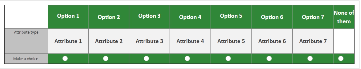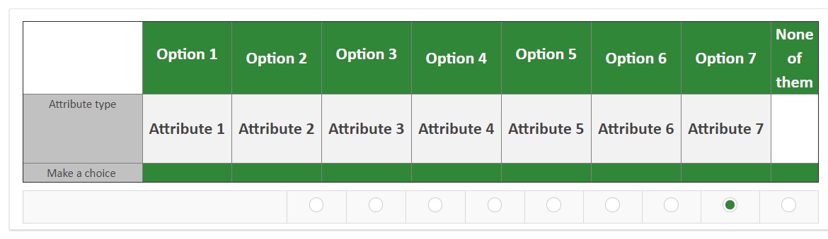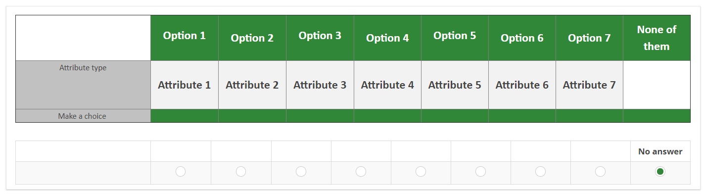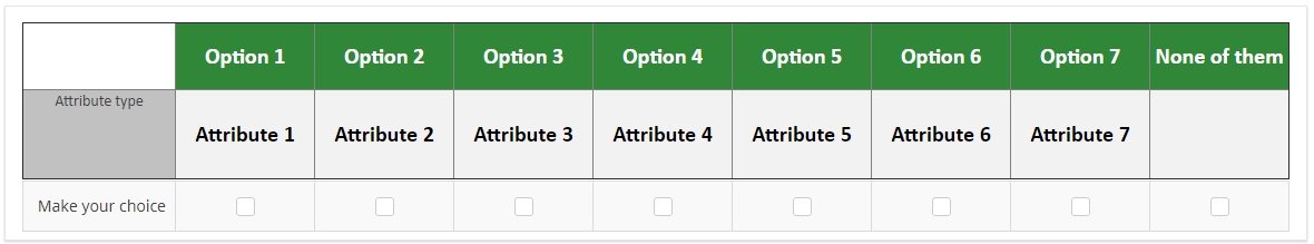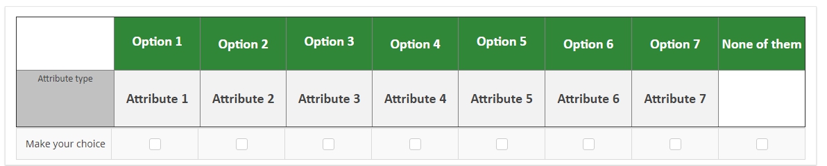 The codes I used are:<table border="1" cellpadding="0" cellspacing="0" style="border-collapse:collapse;"> <tbody> <tr> <td colspan="2" style="text-align: center;" width="10%"> </td> <td bgcolor="#308737" style="text-align: center;" width="12%"><br /><span style="color:#ffffff;font-size:20px;"><span style="color:#ffffff;font-size:20px;"><strong>Option 1</strong></span><br /> </span></td> <td bgcolor="#308737" style="text-align: center;" width="12%"><span style="color:#ffffff;font-size:20px;"><span style="color:#ffffff;font-size:20px;"><strong>Option 2</strong></span> </span></td> <td bgcolor="#308737" style="text-align: center;" width="12%"><br /><span style="color:#ffffff;font-size:20px;"><span style="color:#ffffff;font-size:20px;"><strong>Option 3</strong></span><br /> </span></td> <td bgcolor="#308737" style="text-align: center;" width="12%"><span style="color:#ffffff;font-size:20px;"><span style="color:#ffffff;font-size:20px;"><strong>Option 4</strong></span> </span></td> <td bgcolor="#308737" style="text-align: center;" width="12%"><br /><span style="color:#ffffff;font-size:20px;"><span style="color:#ffffff;font-size:20px;"><strong>Option 5</strong></span><br /> </span></td> <td bgcolor="#308737" style="text-align: center;" width="12%"><span style="color:#ffffff;font-size:20px;"><span style="color:#ffffff;font-size:20px;"><strong>Option 6</strong></span> </span></td> <td bgcolor="#308737" style="text-align: center;" width="12%"><span style="color:#ffffff;font-size:20px;"><span style="color:#ffffff;font-size:20px;"><strong>Option 7</strong></span> </span></td> <td bgcolor="#308737" style="text-align: center;" width="12%"><span style="color:#ffffff;font-size:20px;"><span style="color:#ffffff;font-size:20px;"><strong>None of them</strong></span> </span></td> </tr> <tr> <td bgcolor="#c1c1c1" colspan="2" style="text-align: center;"><span style="font-size:14px;">Attribute type</span> </td> </td> <td bgcolor="#f2f2f2" style="text-align: center;"><span style="font-size:20px;"><strong> Attribute 1</strong></span></td> <td bgcolor="#f2f2f2" style="text-align: center;"><span style="font-size:20px;"><strong> Attribute 2</strong></span></td> <td bgcolor="#f2f2f2" style="text-align: center;"><span style="font-size:20px;"><strong> Attribute 3</strong></span></td> <td bgcolor="#f2f2f2" style="text-align: center;"><span style="font-size:20px;"><strong> Attribute 4</strong></span></td> <td bgcolor="#f2f2f2" style="text-align: center;"><span style="font-size:20px;"><strong> Attribute 5</strong></span></td> <td bgcolor="#f2f2f2" style="text-align: center;"><span style="font-size:20px;"><strong> Attribute 6</strong></span></td> <td bgcolor="#f2f2f2" style="text-align: center;"><span style="font-size:20px;"><strong> Attribute 7</strong></span></td> <td style="text-align: center;" width="37%"><span style="font-size:20px;"><span style="font-size:20px;"><strong> </strong></span> </span></td> </tr> <tr> <td bgcolor="#c1c1c1" colspan="2" style="text-align: center;"><span style="font-size:14px;">Make a choice </span></td> <td bgcolor="#308737" style="text-align: center;"> </td> <td bgcolor="#308737" style="text-align: center;"> </td> <td bgcolor="#308737" style="text-align: center;"> </td> <td bgcolor="#308737" style="text-align: center;"> </td> <td bgcolor="#308737" style="text-align: center;"> </td> <td bgcolor="#308737" style="text-align: center;"> </td> <td bgcolor="#308737" style="text-align: center;"> </td> <td bgcolor="#308737" style="text-align: center;"> </td> </tr> </tbody></table><script type="text/javascript" charset="utf-8"> $(document).on('ready pjax:scriptcomplete',function(){ // Identify this question var thisQuestion = $('#question{QID}'); // Move the radios $('.question-text table:eq(0) tr:last td:eq(1)', thisQuestion).append($('.subquestion-list .answers-list:eq(0) .answer-item:eq(0) *', thisQuestion)); $('.question-text table:eq(0) tr:last td:eq(2)', thisQuestion).append($('.subquestion-list .answers-list:eq(0) .answer-item:eq(1) *', thisQuestion)); $('.question-text table:eq(0) tr:last td:eq(3)', thisQuestion).append($('.subquestion-list .answers-list:eq(0) .answer-item:eq(2) *', thisQuestion)); $('.question-text table:eq(0) tr:last td:eq(4)', thisQuestion).append($('.subquestion-list .answers-list:eq(0) .answer-item:eq(3) *', thisQuestion)); $('.question-text table:eq(0) tr:last td:eq(5)', thisQuestion).append($('.subquestion-list .answers-list:eq(0) .answer-item:eq(4) *', thisQuestion)); $('.question-text table:eq(0) tr:last td:eq(6)', thisQuestion).append($('.subquestion-list .answers-list:eq(0) .answer-item:eq(5) *', thisQuestion)); $('.question-text table:eq(0) tr:last td:eq(7)', thisQuestion).append($('.subquestion-list .answers-list:eq(0) .answer-item:eq(6) *', thisQuestion)); $('.question-text table:eq(0) tr:last td:eq(