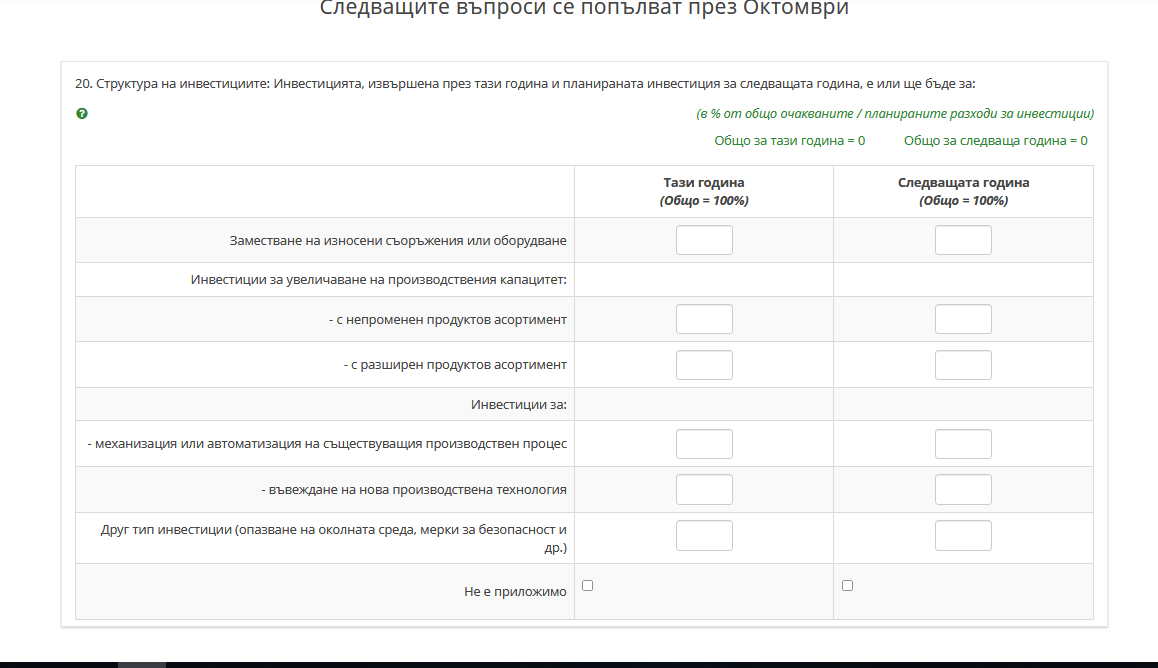 <script type="text/javascript" data-author="Tony Partner"> $(document).on('ready pjax:scriptcomplete',function(){ // Identify this question var qID = '{QID}'; var thisQuestion = $('#question'+qID); var exclusiveRow = $('tr[id^="javatbd"]:last', thisQuestion); var normalRows = $('tr[id^="javatbd"]', thisQuestion).not(exclusiveRow); // The value to be loaded in the exclusive inputs var exclusiveVal = '1'; // Index the array columns $('table.subquestion-list tr', thisQuestion).each(function(i) { $('> *', this).each(function(i) { $(this).attr('data-index', i); }); }); // Hide the last-row inputs $(':text', exclusiveRow).hide(); // Insert the check-boxes $('.answer-item', exclusiveRow).each(function(i) { var thisIndex = $(this).attr('data-index'); $(this).addClass('with-inserted-checkbox').append('<span class="checkbox-item">\ <input type="checkbox" name="insertedInput'+thisIndex+'" id="insertedInput'+thisIndex+'" value="" />\ <label for="insertedInput'+thisIndex+'" class="checkbox-label control-label"></label>\ </span>'); }); // A listener on the normal text inputs $('input[type="text"]', normalRows).on('change keyup', function (event) { if($.trim($(this).val()) != '') { var thisCell = $(this).closest('.answer-item'); var thisIndex = $(thisCell).attr('data-index'); $('.answer-item[data-index="'+thisIndex+'"] input[type="hidden"]', exclusiveRow).val(''); $('.answer-item[data-index="'+thisIndex+'"] :text', exclusiveRow).val('').trigger('keyup'); $('.answer-item[data-index="'+thisIndex+'"] :checkbox', exclusiveRow).prop('checked', false); } }); // Listener on the exclusive checkboxes $(':checkbox', exclusiveRow).on('change', function (event) { if($(this).is(':checked')) { var thisCell = $(this).closest('.answer-item'); var thisIndex = $(thisCell).attr('data-index'); $('.answer-item[data-index="'+thisIndex+'"] input[type="hidden"]', normalRows).val(''); $('.answer-item[data-index="'+thisIndex+'"] :text', normalRows).val('').trigger('keyup'); $(':text', thisCell).val(exclusiveVal).trigger('keyup'); } else { $(':text', thisCell).val('').trigger('keyup'); } }); }); </script>