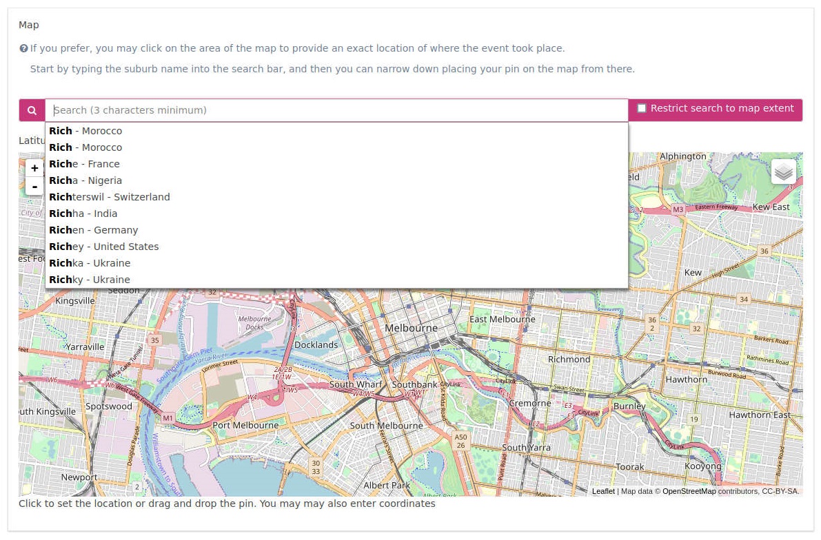In a survey, for a question, I would like the respondent to be able to type in an address and have it pinned on OpenStreetMap. With the current implementation, it seems the user can only search for suburb names in the search field---addresses return no results. At least in Australia, with the screencast example I’ll attach below.